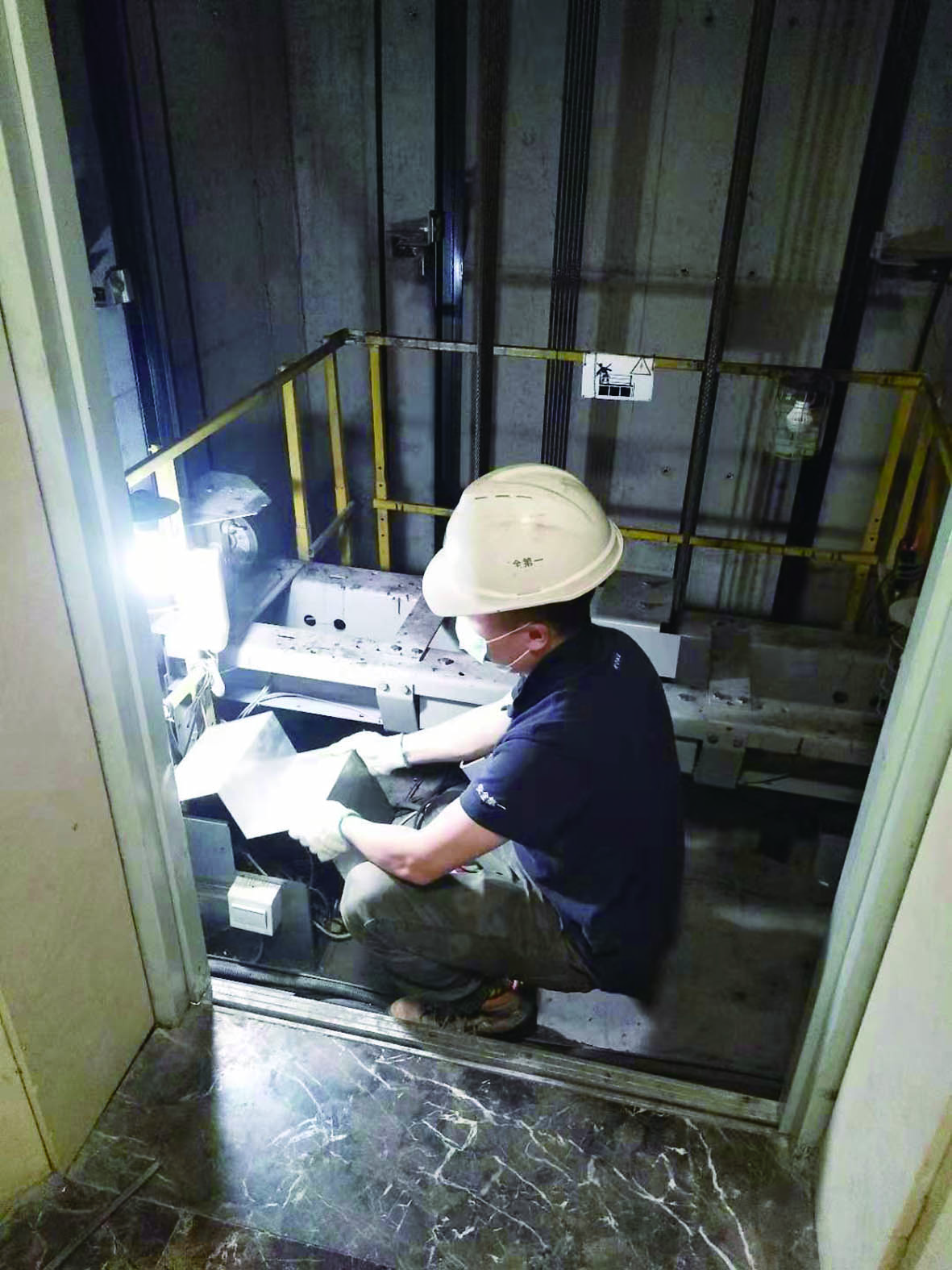 保险公司聘请的运维人员正在对小区电梯进行维保。 吴楚/摄