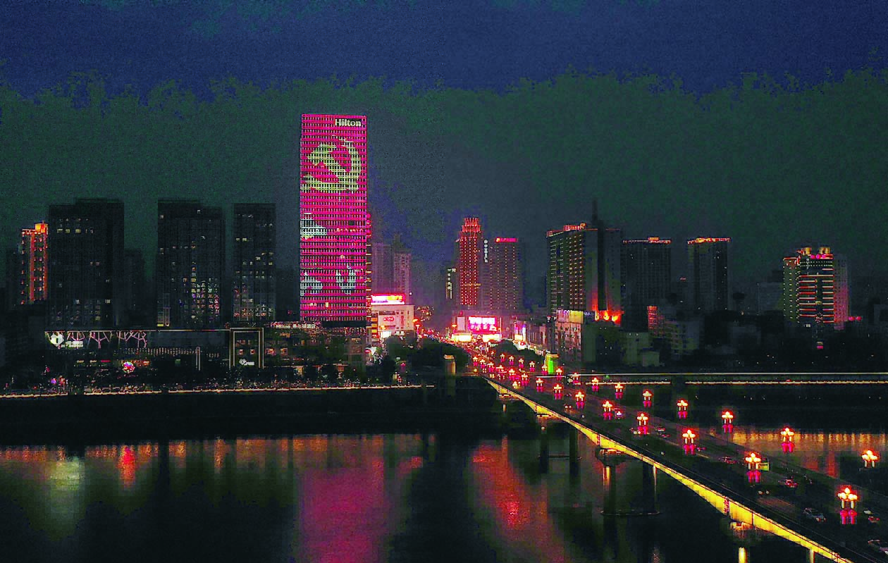 为庆祝中国共产党成立100周年,湘江两岸的楼宇、桥体,齐齐亮起炫彩灯光,建筑变身恢弘“画布”,光影倒映在江面,满城璀璨。