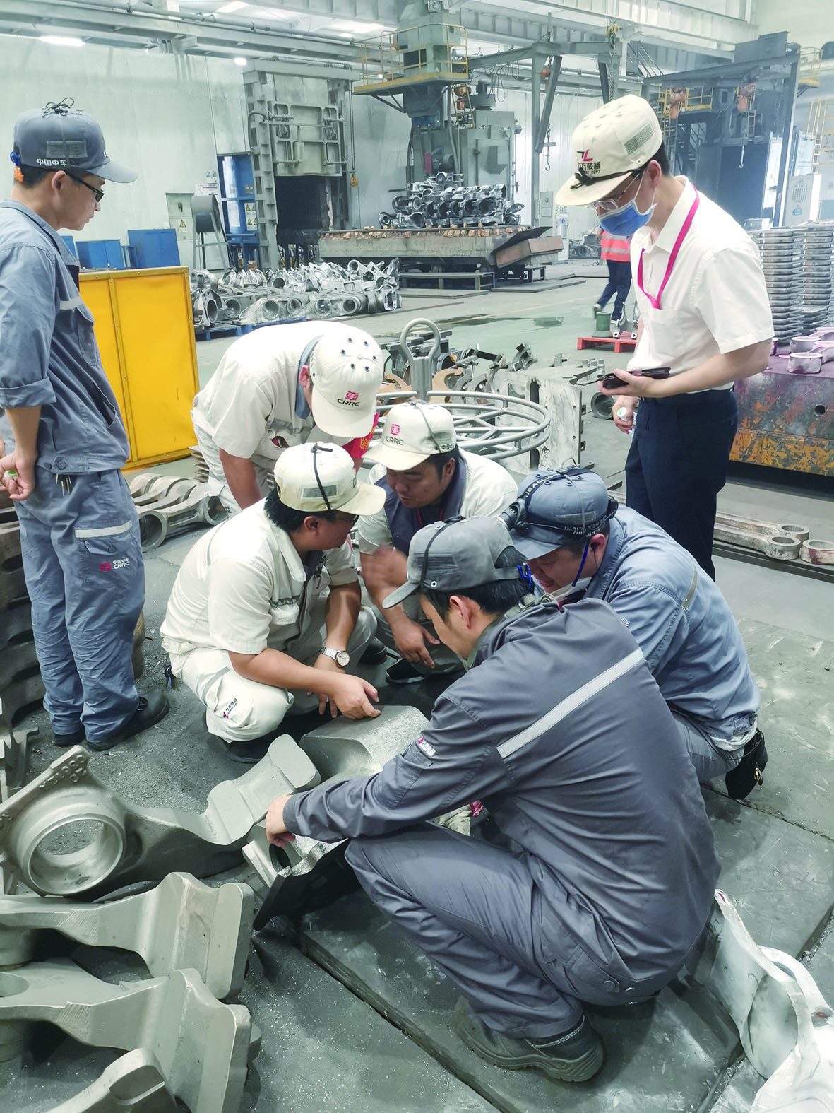 中车株机公司转向架事业部党委党员突击队成员到九方装备制造中心现场进行铸件探伤指导。 受访者供图