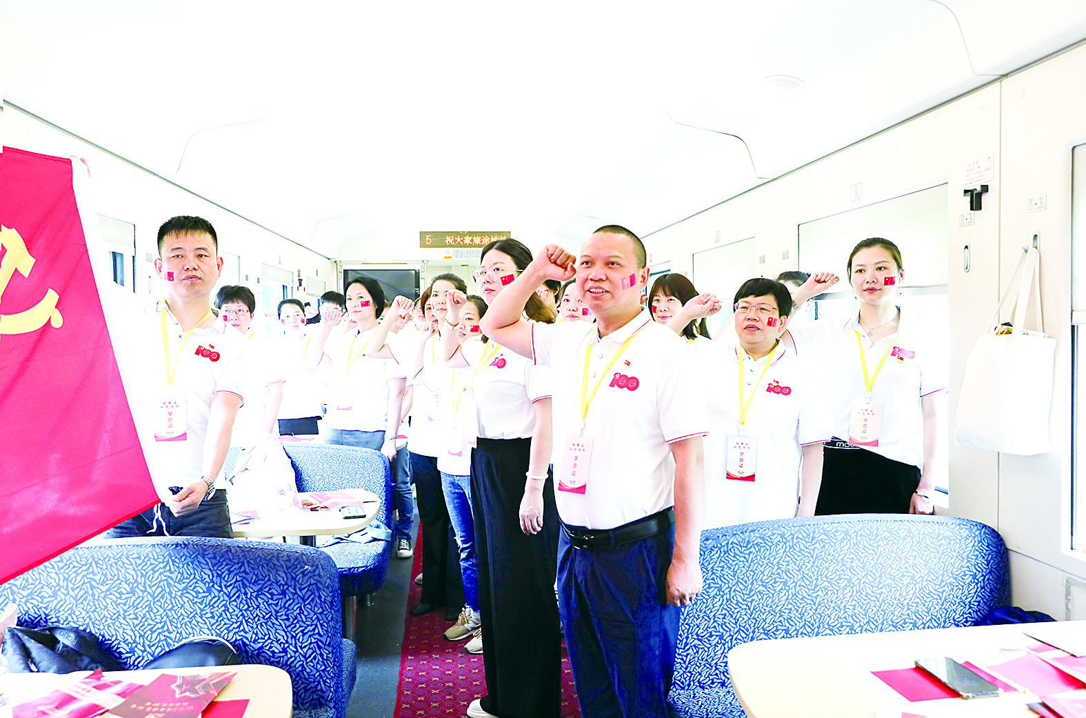 党委书记龙永其率党员在“湘赣边红色专列”重温入党誓词。