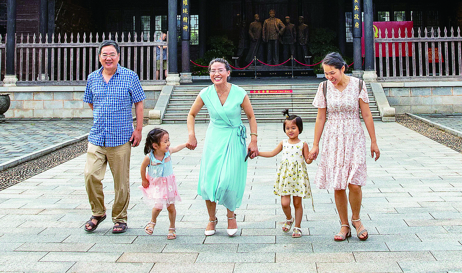谭胜娇夫妇跟养女小琴(右一)带着孩子在县城游玩。