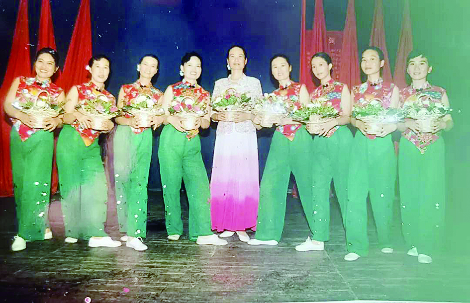 1996年7月1日下午,我们在自己企业的舞台上闪亮登场。“花篮的花儿香,听我来唱一唱,唱一呀唱。来到了南泥湾,南泥湾好地方,好地呀方……”伴随着言师傅专业的女高音,我们翩翩起舞;言师傅那条由粉色渐变成玫红色的长裙,我们的红花兜肚加亮片绿裤,将文艺会演推向了高潮。