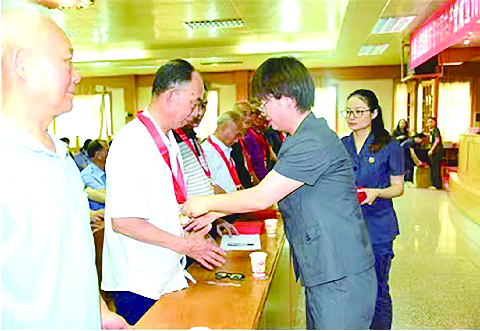 刘艳辉为老党员们颁发“光荣在党50年”纪念章