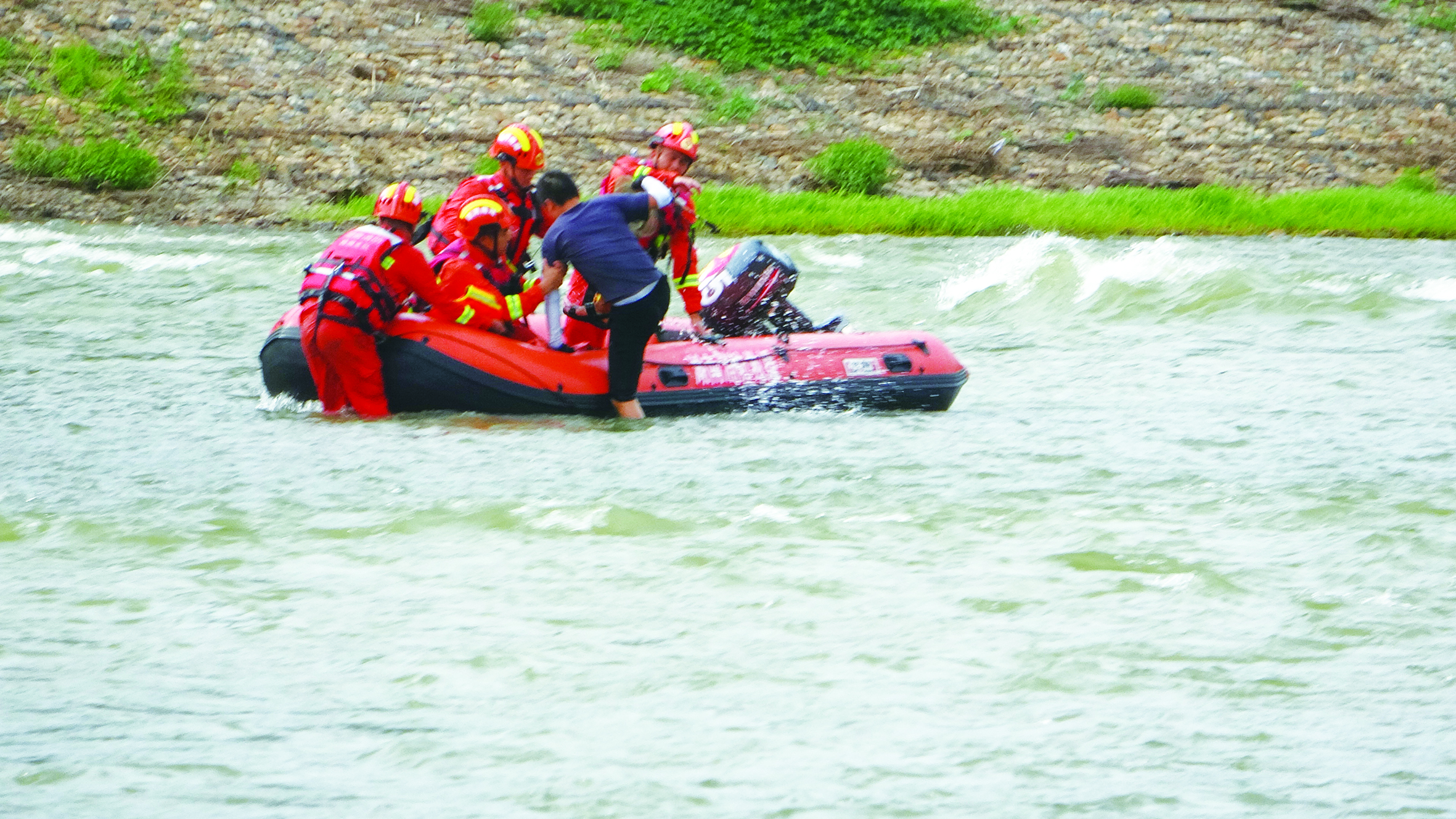 “被困者处于河中央,距离岸边大约80米,当时水流湍急,天也在下雨,给救援增添了不小难度。”赶赴现场的消防队员介绍,通过无人机空中勘探水域情况,发现被困人周边藏有暗涌,不得不放弃原定的用漂浮绳救援的方案,由另一组消防队员穿戴好救生衣,驾驶皮划艇冲进湍急的河中,逐步向被困男子靠近。经过10余分钟紧张施援,在消防队员和民警的齐心协力下,成功将“钓鱼哥”拉上了皮划艇,转移至河岸。