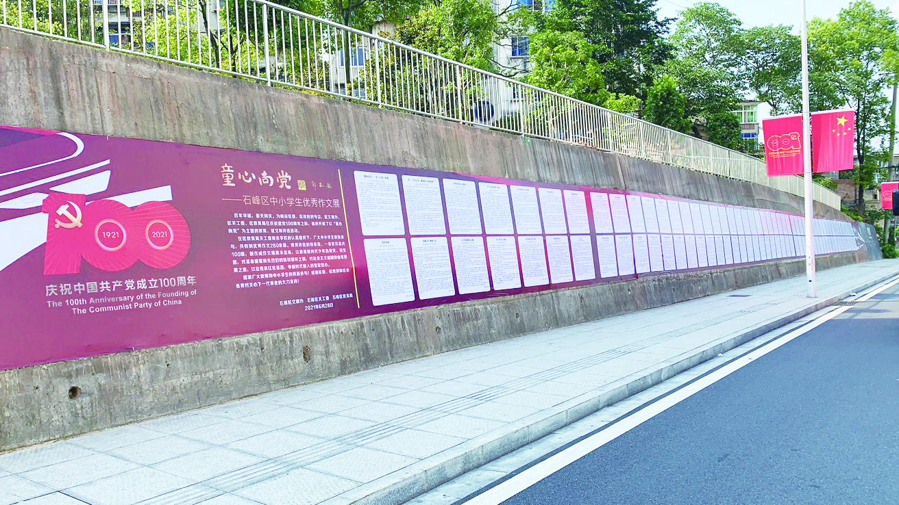位于石峰区响石广场的“童心向党”中小学生优秀作文墙。 通讯员 供图