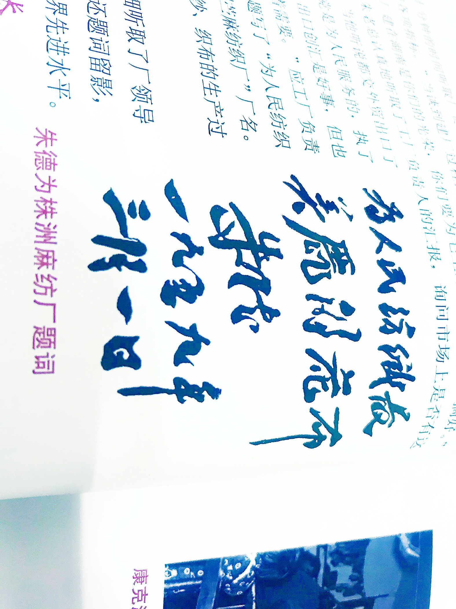 汇报会议即将结束,厂党委宣传部的工作人员捧来笔墨纸砚,敬请朱德为新兴的麻纺织工业题词留念。朱德一边满口答应,一边思索着问:写什么好呢?站在他身后的秘书轻轻献言:就写“为人民纺织最美丽的花布”吧!朱德点点头,说了声好,铺展宣纸,提笔蘸墨,一气呵成十二个大字。当朱德写到美丽的“丽”字时,由于繁体“麗”字头与“严”字头相近,下笔误将丽字头写成了“严”字头,坐在旁边的康克清立即提醒朱德:“是丽字头,不是严字头。”朱德不动声色,沉着冷静地说:“好改嘛。”笔尖侧锋略略顿挫,“严”字头笔画稍稍粗壮些许,便成了“丽”字头。这幅字黑迹未干,田莉又请求说:请朱副主席给我们厂题个厂名吧!朱德笑了笑,抓笔饱蘸浓墨,运腕挥毫,在雪白的宣纸上写下了“株洲苎麻纺织厂”七个刚劲挺拔的招牌字。