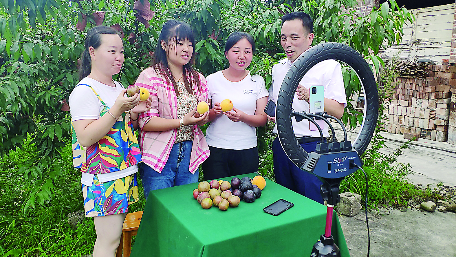 炎陵县日前邀请株洲利坤职校的老师,在该县下村乡举办为期10天的农产品直播带货特训营,吸引50多名村民参加。授课老师采取理论+实操形式,围绕直播平台的运营、视频照片拍摄、微信抖音直播等,讲解如何利用直播平台销售农产品。图为老师(右1)现场指导村民直播带货销售黄桃奈李等。