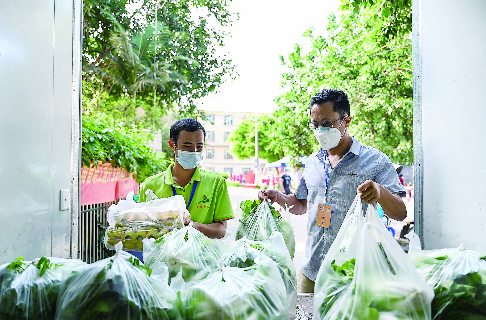 7月8日,友谊社区保供点工作人员在搬运生活物资。 云南省瑞丽市新冠肺炎疫情防控工作指挥部发布通告,7月7日0时起,对主城区实行封闭管理,所有市民居家隔离。目前,瑞丽市在市内设立23处保供点,联合电商配送平台及网格工作人员,保障居民生活必需品供应。新华社记者 王冠森 摄