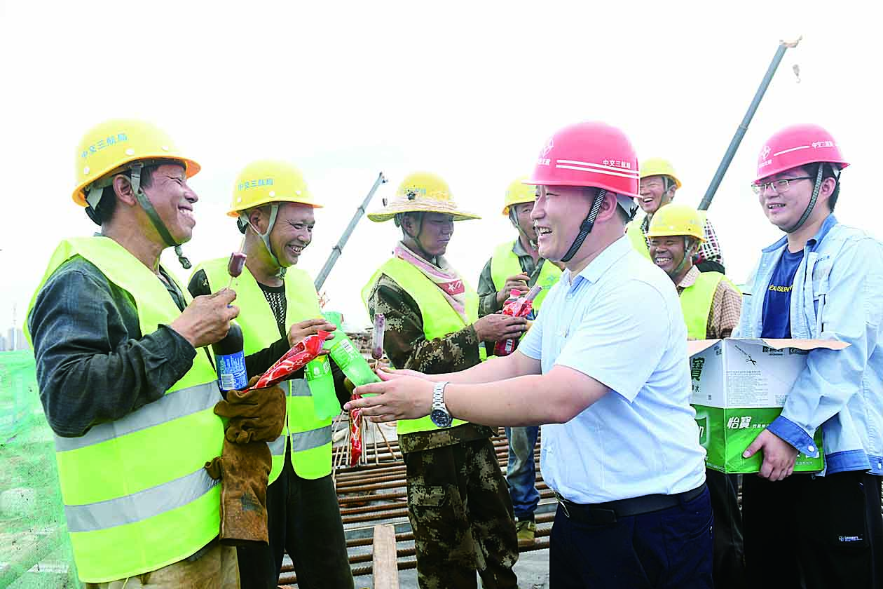 7月9日下午,火辣辣的阳光照耀下,清水塘大桥项目部工作人员来到石峰侧引桥施工现场,为正在这里顶着烈日工作的钢筋工、电焊工、大桥钢箱梁安装工送去了解暑饮料和冰激凌。中交三航局相关负责人李晓强介绍,这段时间,他们将错开一天中最热的时间施工,并定期为各工地送去防暑物资。