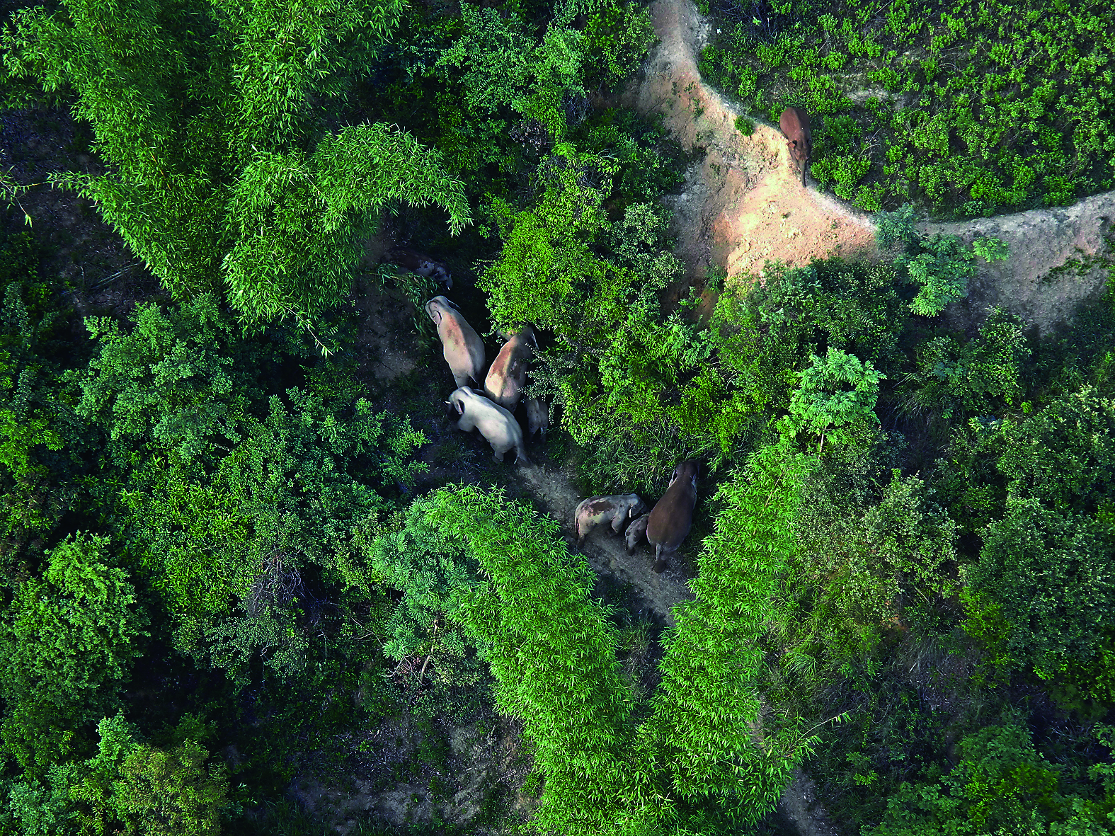 7月10日在红河州石屏县拍摄的象群(无人机照片)。新华社发
