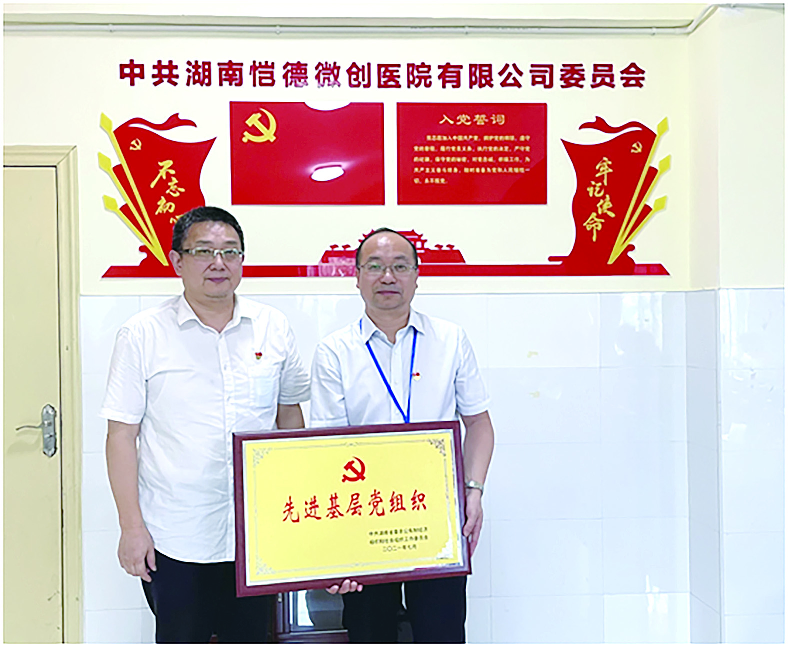 7月8日,株洲恺德心血管病医院举行庆祝建党100周年暨七一表彰大会。会上,市卫健委党委委员、副主任邓跃东代表上级党委向该院颁发湖南省两新领域“先进基层党组织”奖牌。