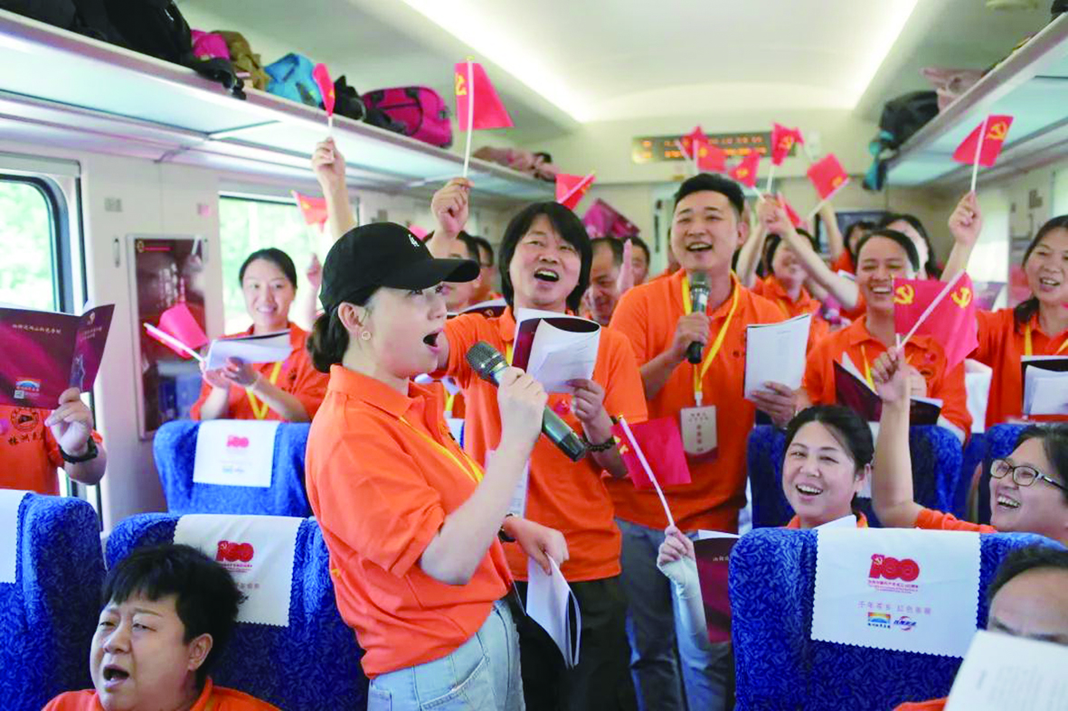 “没有共产党就没有新中国”“我和我的祖国,一刻也不能分割”“团结就是力量”……列车徐徐前行,一首首红色歌曲从车厢里传播开来,大家唱得心潮澎湃。