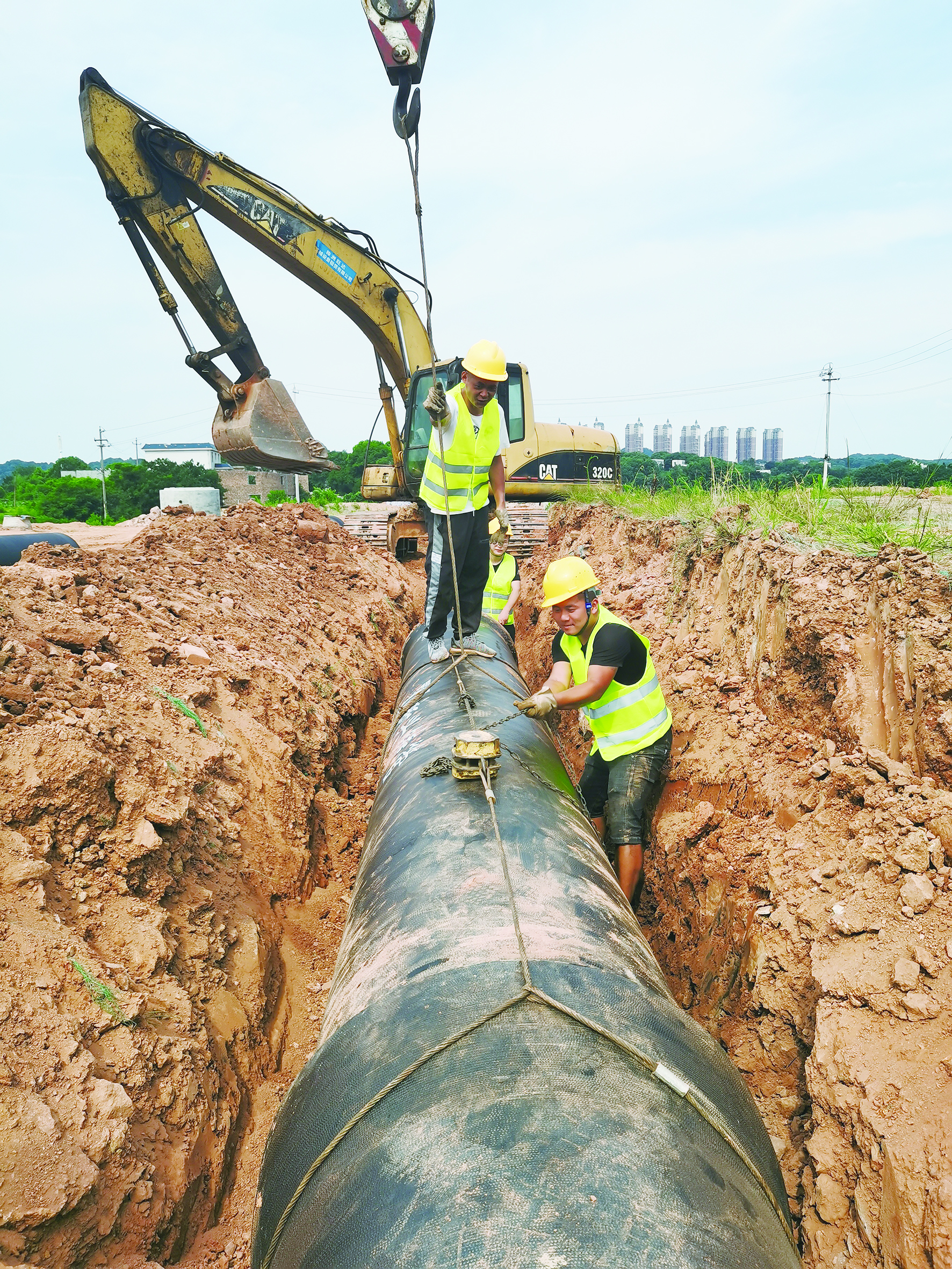 7月15日下午3点,包新敏和同事们“推”着建设中的供水管道,顺着新修的沿江南路延伸方向,向前“挺进”。为了敷设这条管道,挖掘机先挖出了两米深、一米宽的土沟槽,接下来,包括包新敏在内的五六个大汉就要窝在这个窄而深的沟槽里,完成修槽、铺管、接管等工序。下到沟槽里不到几秒钟,就汗湿了衣衫。