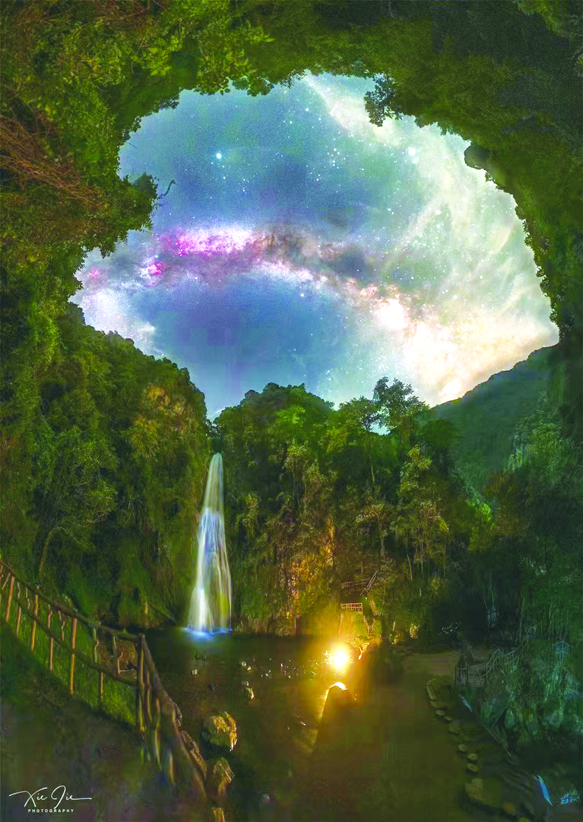 “飞流直下三千尺,疑是银河落九天”。 古人描绘的场景在这里还原了。最近,长沙市宁乡市的业余星空摄影师谢杰在炎陵县神农谷景区拍摄的一张照片火了,继登上《中国国家天文》、微博热搜榜之后,11月2日,这张照片又登上美国宇航局天文图片网的主页。 谢杰说:“我很早就想拍摄一张银河与瀑布同框的照片,终于在神农谷里发现了这么一条瀑布。这里光污染很小,银河清晰明亮,河流从悬崖上落下来,形成了珠帘瀑布,好像是从银河里流出来的一般,非常美丽。”