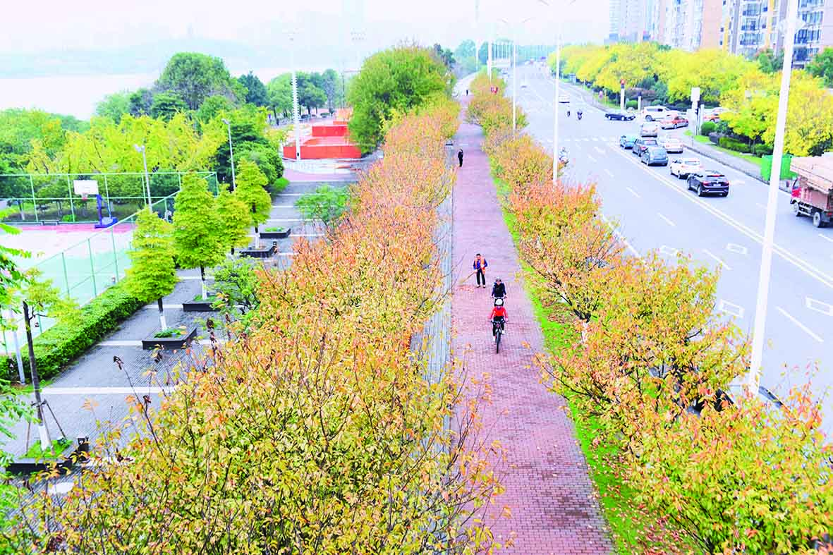 刚刚立冬,株洲的天气明显冷了很多。不过,城市里的暖色调,还是给人一抹温暖。河西滨江路五桥段,金黄色的樱花树把最美的姿态展现了出来,一片片黄色的叶子随风飘落,给大地铺上了一块金黄的地毯。一些市民骑着自行车有意从这里穿过,就是想体验一下那种人在画中游的感觉。
