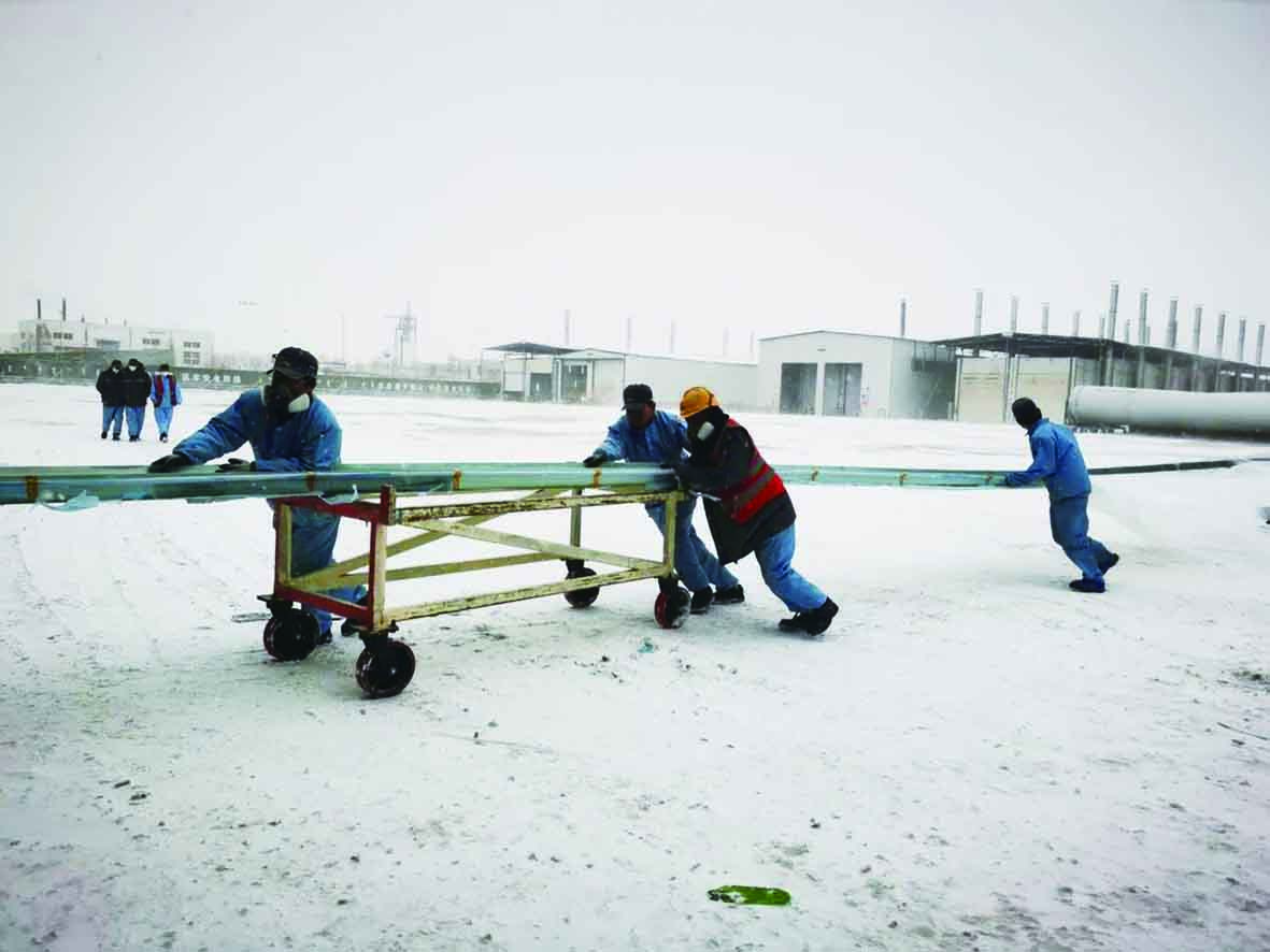 近日,北方部分地区大雪,位于内蒙古自治区鄂尔多斯市的株洲时代新材料科技股份有限公司蒙西工厂,也迎来了2021年的第一场雪。在肆虐的西北风下,漫天飞舞的白雪很快覆盖了整个厂区,当地气温也下降到零下十几摄氏度。工厂的生产交付尤其是叶片转运和道路通行,遇到了很多困难。凛冽寒风中,工厂员工们迅速行动,清扫积雪,畅通道路,坚守岗位,冒着风雪转运风电叶片腹板,风雪无阻保障全年订单保质保量如期交付。