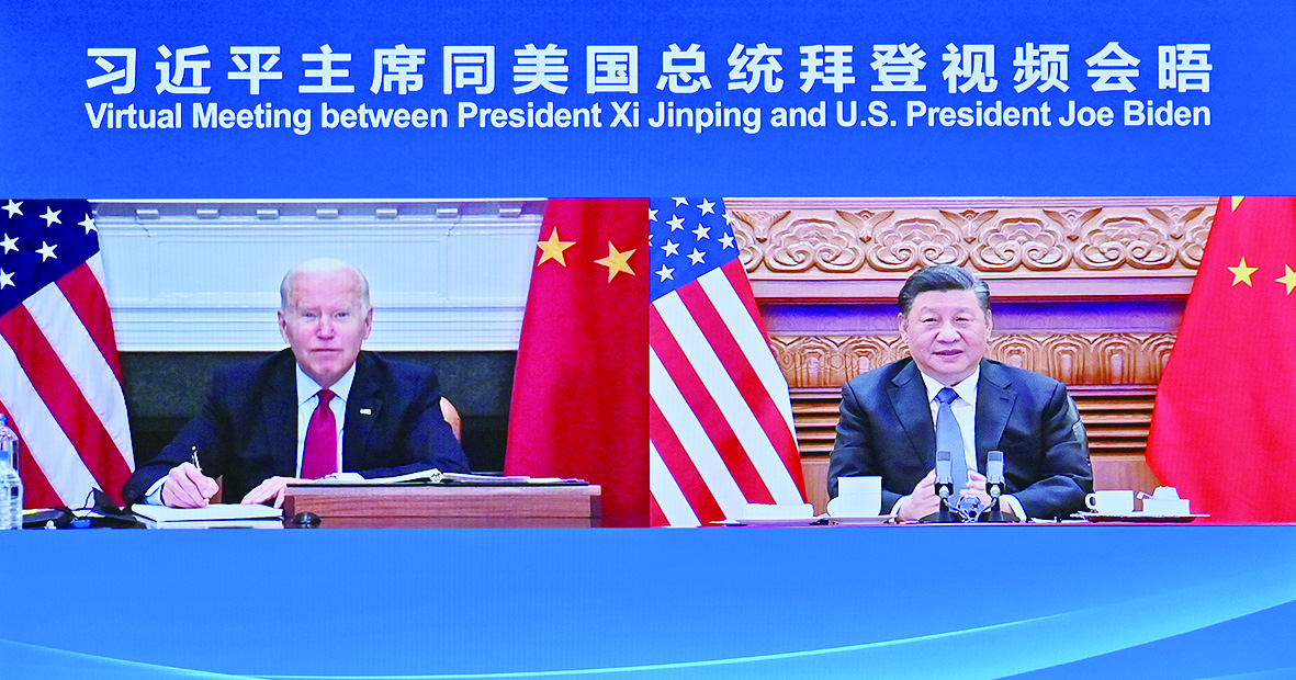 11月16日上午,国家主席习近平在北京同美国总统拜登举行视频会晤。 新华社记者/岳月伟 摄