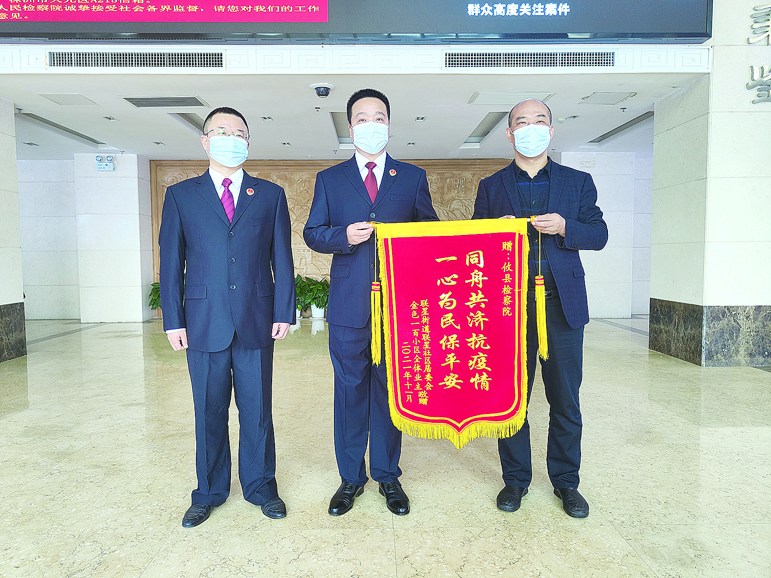 11月4日,攸县联星街道联星社区的社区工作人员来到攸县人民检察院,递送了一面印有“同舟共济抗疫情,一心为民保平安”的锦旗,以此感谢攸县人民检察院在抗击疫情中作的贡献。