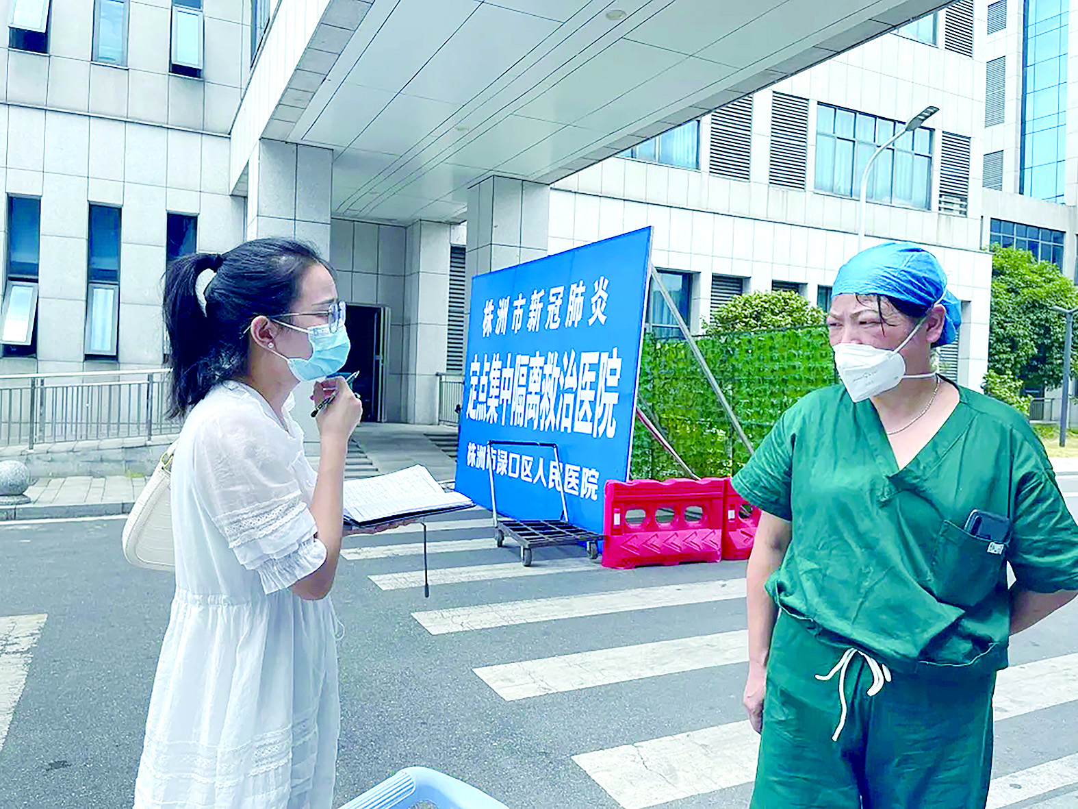 记者邹怡敏(右一)在抗疫一线采访。 株洲日报·掌上株洲通讯员/朱刚 摄