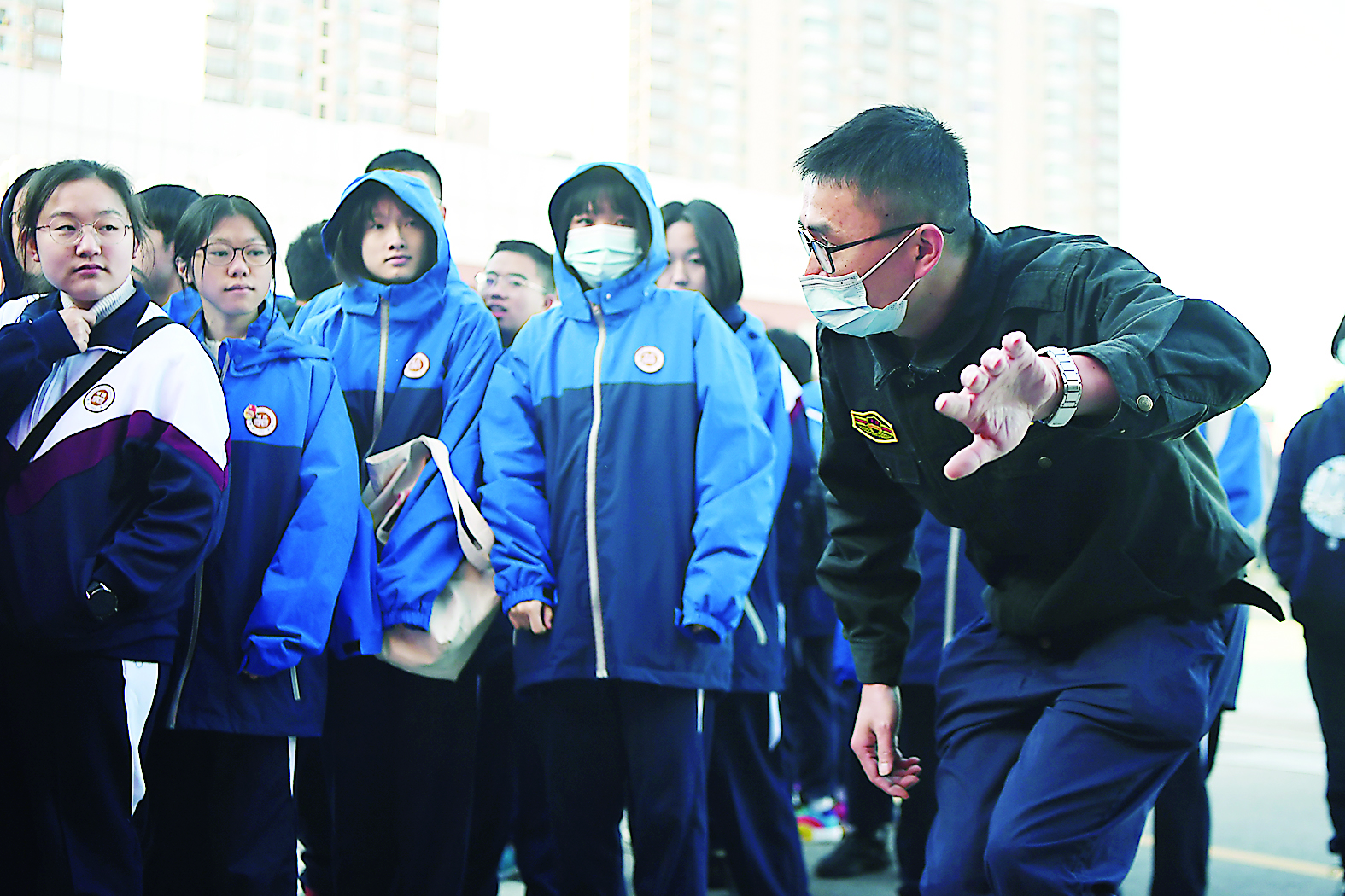 11月8日,消防安全宣传教官(右一)在长沙市明德中学向学生演示如何在火灾中逃生。 当日,为迎接 “119消防宣传日”,湖南省长沙市明德中学开展消防安全知识进校园活动,让学生们通过消防知识宣讲、火灾逃生体验等环节提升消防安全意识。 新华社记者 薛宇舸 摄