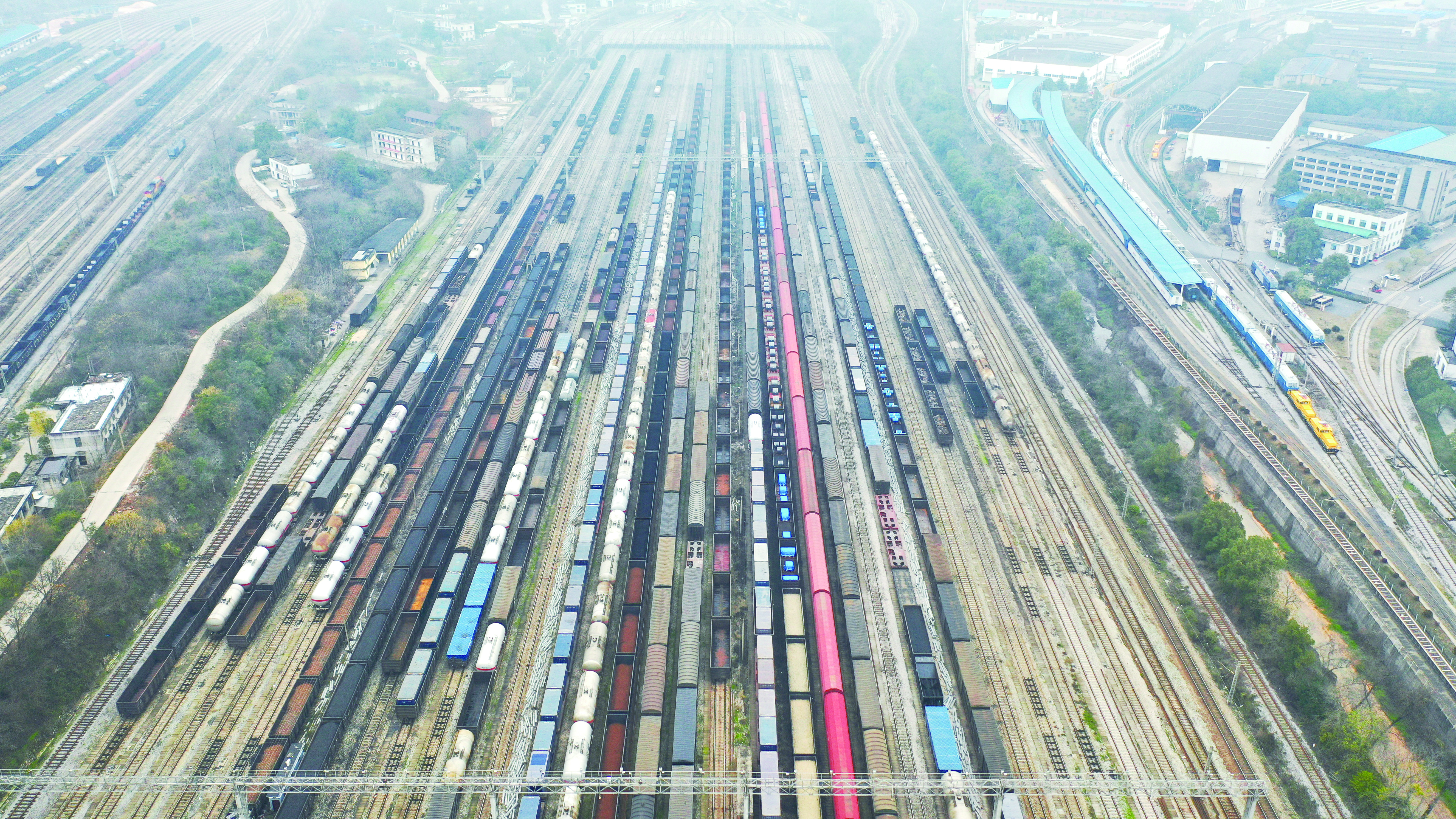株洲北站地处京广、沪昆两大铁路干线交汇处,是全路十大货运编组站。进入四季度,传统货运迎来需求旺季,株洲北站到发量持续保持高位增长,日均办理车和有调作业车数,已接近车站最大处理能力。11月9日,记者了解到,11月5日,该站日办理车数达21585辆,刷新该站历史记录。图为鸟瞰株洲北站。