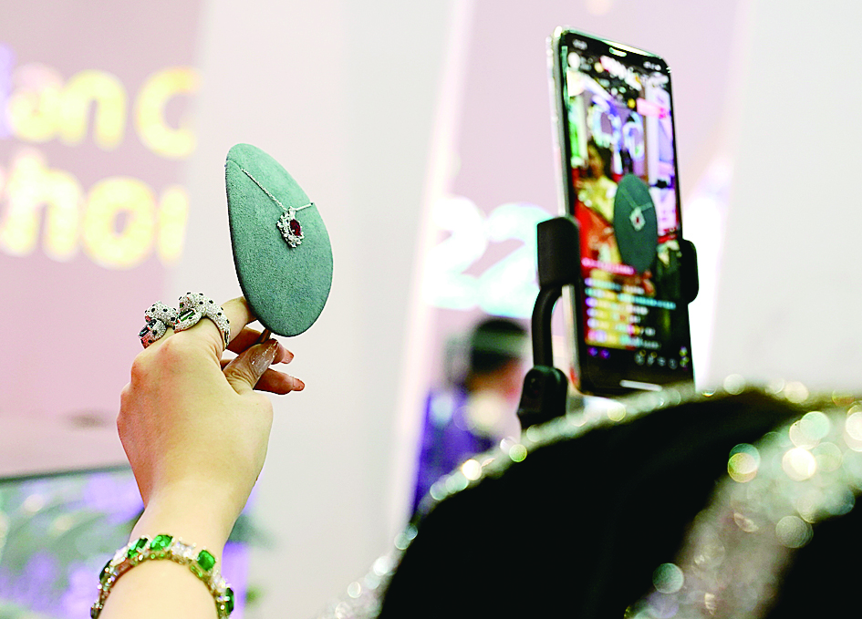 11月9日,在进博会消费品展区,一家首饰参展商的工作人员在进行“双十一”活动直播。 在第四届进博会上,众多参展商在展台进行融合电商直播,将展品在电商平台即时“上架”,通过进博会的平台和契机,让展品变成热销的商品,促进线下和线上联动,让消费者可以方便快捷地购买到展会好物和“网红”展品。