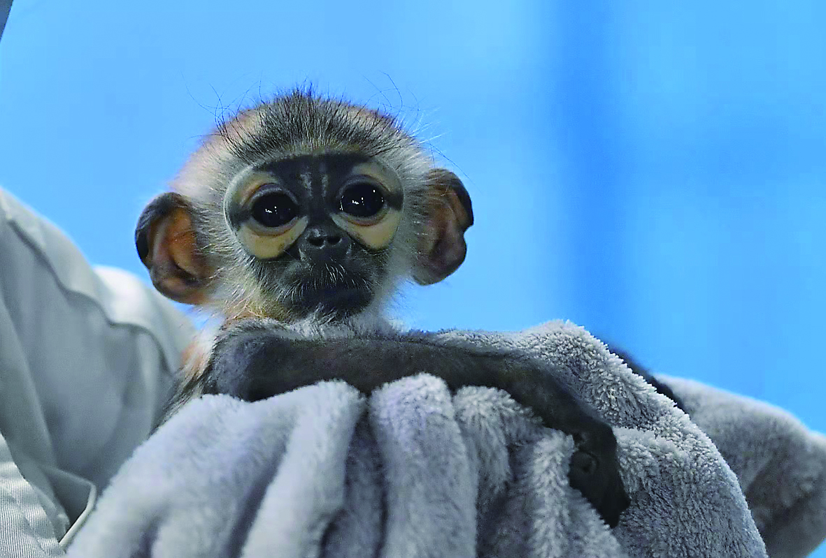 11月10日,国内首例人工繁育成功的黑腿白臀叶猴宝宝在广州长隆灵长类研究中心与观众见面,黑腿白臀叶猴宝宝出生于今年7月。 白臀叶猴被世界自然保护联盟列为世界上最濒危的灵长类动物之一,野生数量不足1000只,多种因素导致其数量不能恢复,通过人工干预让其数量增加是目前相对有效的方法之一。