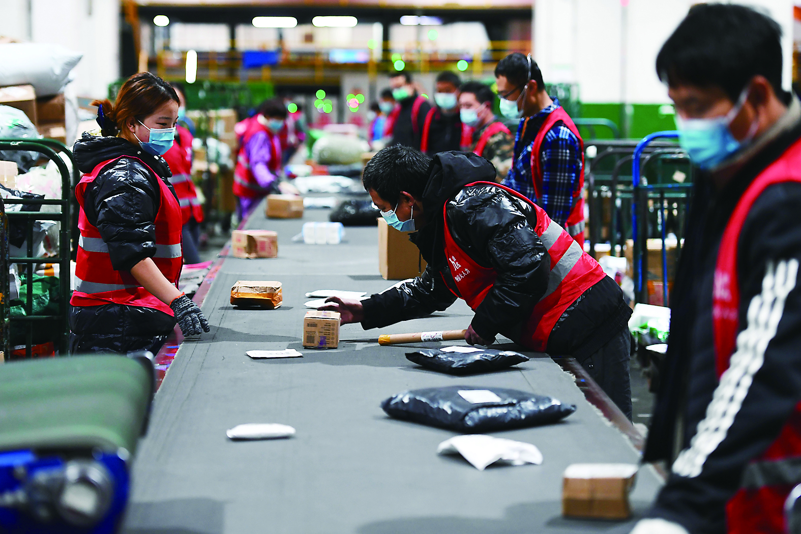 11月11日,在中国邮政集团有限公司河南省郑州邮区中心,工作人员在分拣快递包裹。为应对“双十一”物流高峰,多地物流公司增加人力投入,工作人员加紧将各类商品分拣、装车、配送,保障快递物品及时送达。