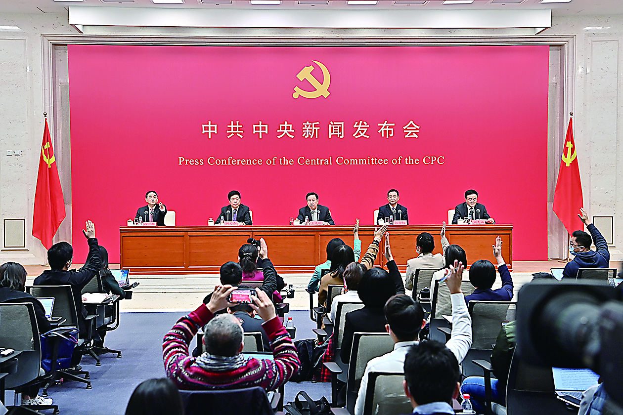 11月12日,中共中央在北京举行新闻发布会,中央宣传部分管日常工作的副部长王晓晖,中央政策研究室主任江金权,中央财经委员会办公室分管日常工作的副主任韩文秀,中央党史和文献研究院院长曲青山介绍党的十九届六中全会精神,并答记者问。发布会由中央宣传部副部长、国务院新闻办公室主任徐麟主持。 新华社记者 李鑫 摄