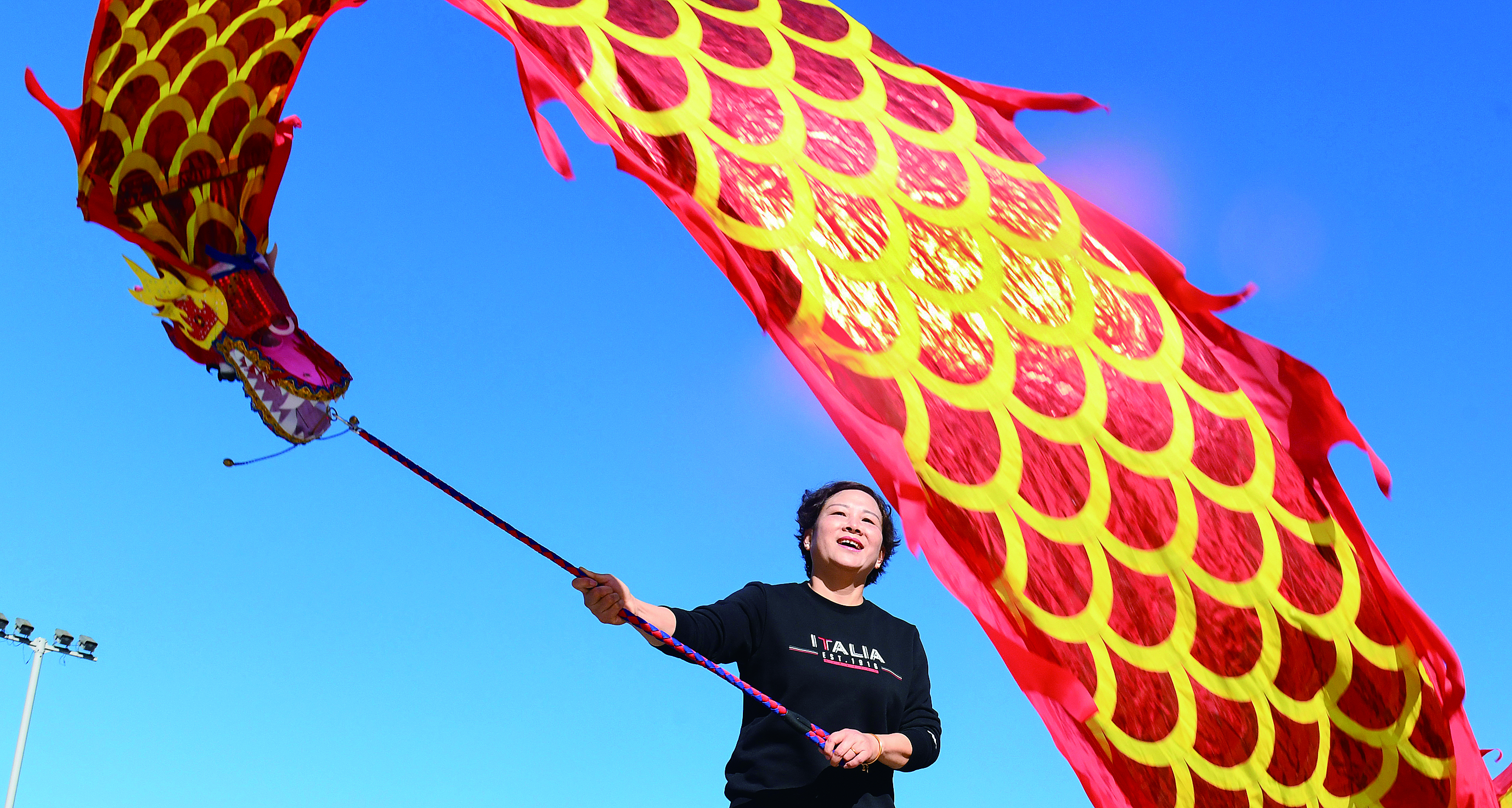 珠江北路,晴朗的天气里,市民快乐地挥舞手中的彩龙。