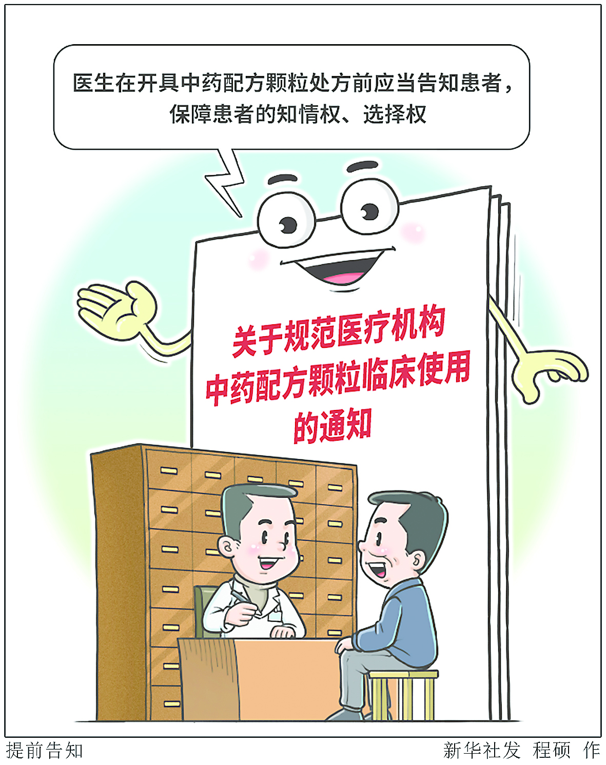 据新华社北京11月18日电 国家卫生健康委办公厅、国家中医药管理局办公室近日联合发布《关于规范医疗机构中药配方颗粒临床使用的通知》。通知要求,医生在开具中药配方颗粒处方前应当告知患者,保障患者的知情权、选择权。