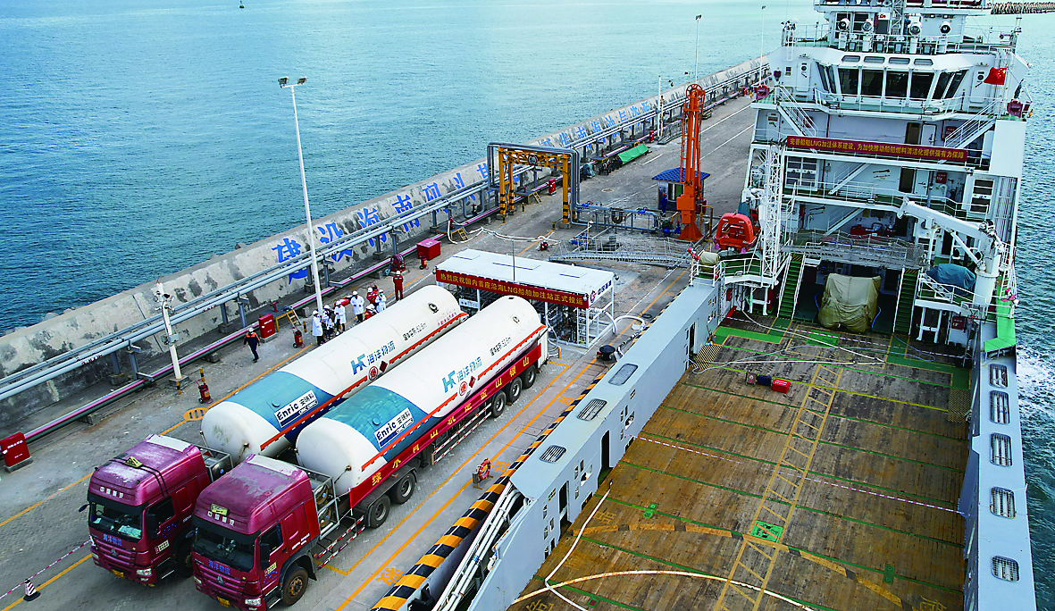 11月20日,由中国海油气电集团建设运营的我国首座沿海液化天然气(LNG)船舶加注站在海南省澄迈县马村港码头正式投运。该加注站的投用填补了国内沿海LNG船舶加注站的空白,为我国推广海洋船舶应用LNG起到示范引领作用。图为当日在海南马村LNG船舶加注站,船舶在加注燃料(无人机照片)。