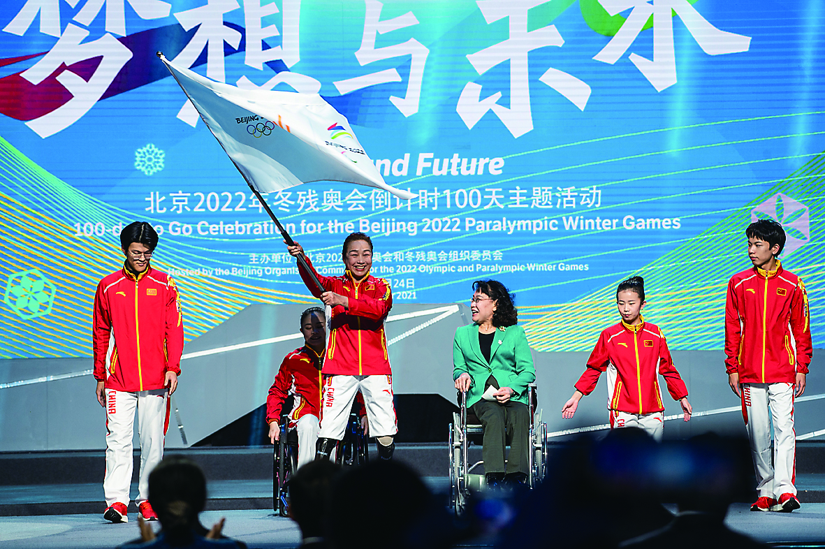 11月24日,中国残联主席张海迪(右二)为冬奥会和冬残奥会赛会志愿者中的残疾人代表授旗。新华社发