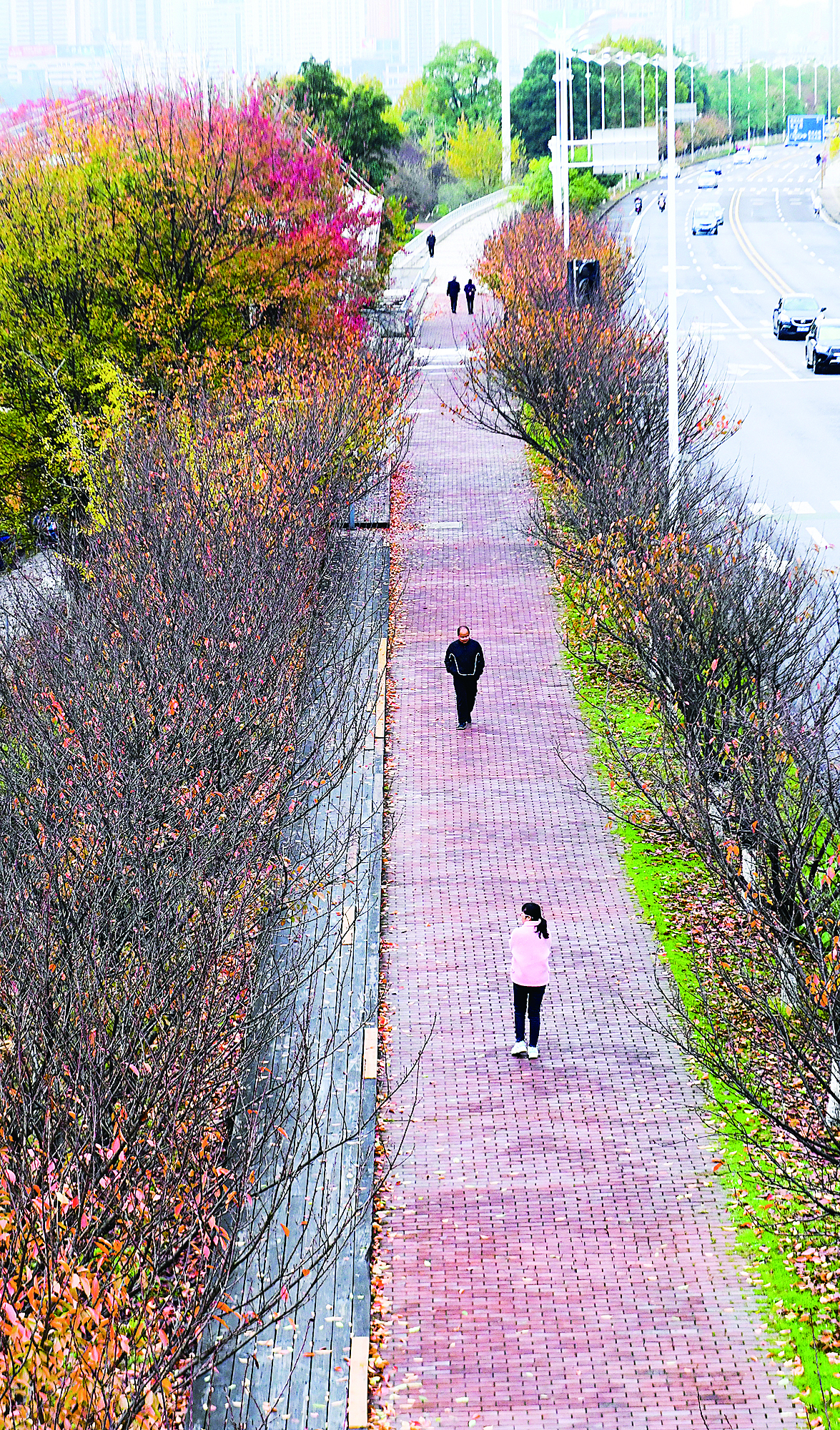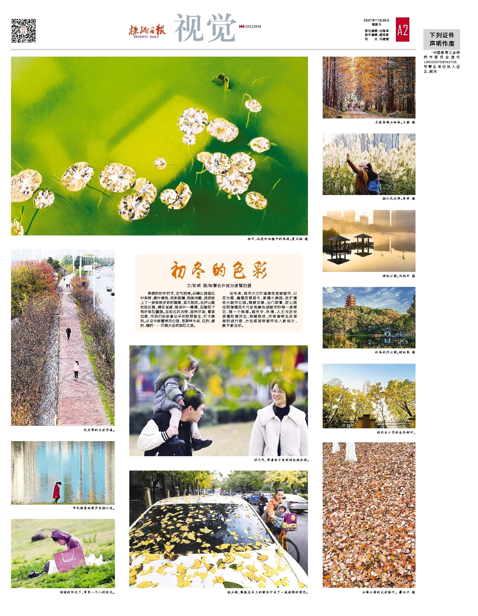 株洲的初冬时节,空气明净。石峰公园里红叶染树、黄叶铺地,色彩斑斓,相映成趣,宛若披上了一条绚丽多彩的绸缎,美不胜收。在庐山路和钻石路,满目金黄,银杏叶一簇簇,在暖阳下格外绚烂耀眼。在沿江风光带,层林尽染,景美如画,市民们纷纷拿出手机拍照留念,打卡游玩。从空中俯瞰神农公园,苍翠林木间,红的、黄的、橙的……尽展大自然绚烂之美。