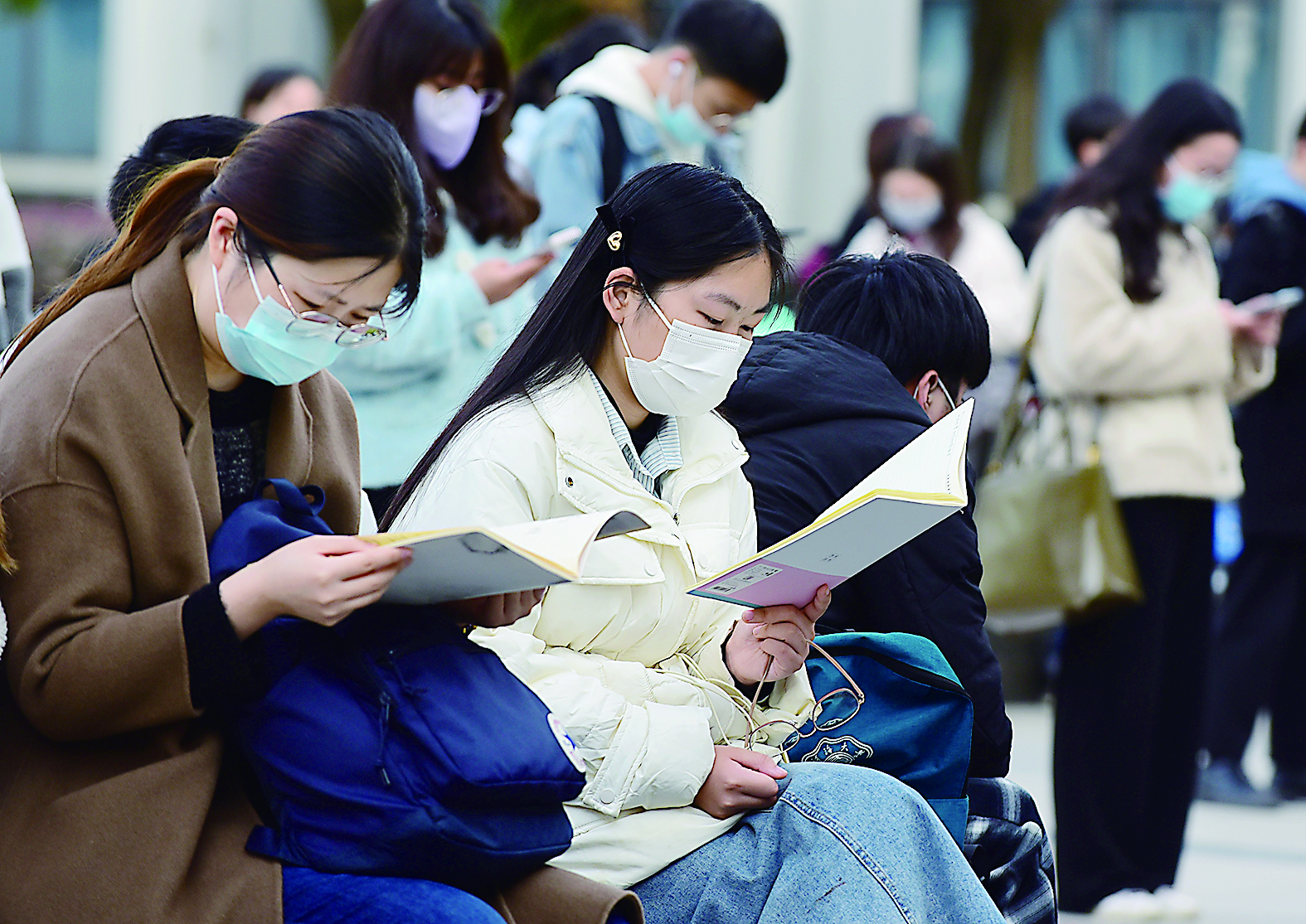11月28日,在江苏无锡旅游商贸高等职业技术学校考点,考生在等候进场时复习。 新华社发(还月亮摄)