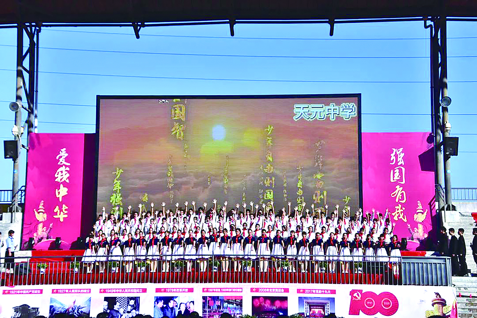 “我们生在红旗下,长在春风里,目光所至,皆为华夏,五星闪耀,皆为信仰……”天元中学1905班、1906班、1907班、1908班带来的大型诗朗诵《强国有我》将现场推向高潮。全体学生许下诺言,将为强国之路贡献属于新时代少年的力量。