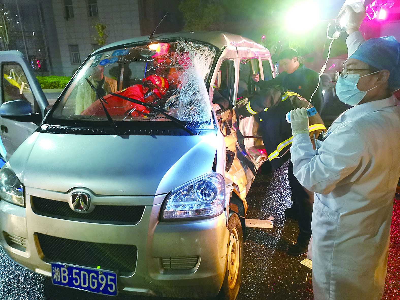 凌晨1时07分,消防员赶赴现场看到,面包车驾驶室被撞得严重变形,司机被方向盘卡住,身体无法动弹,已出现休克症状,现场情况危急。