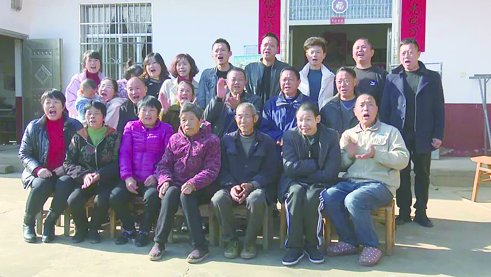 在冬日的暖阳里,肖某左手握着亲弟弟,右边坐着父母,拍下了一张全家福。