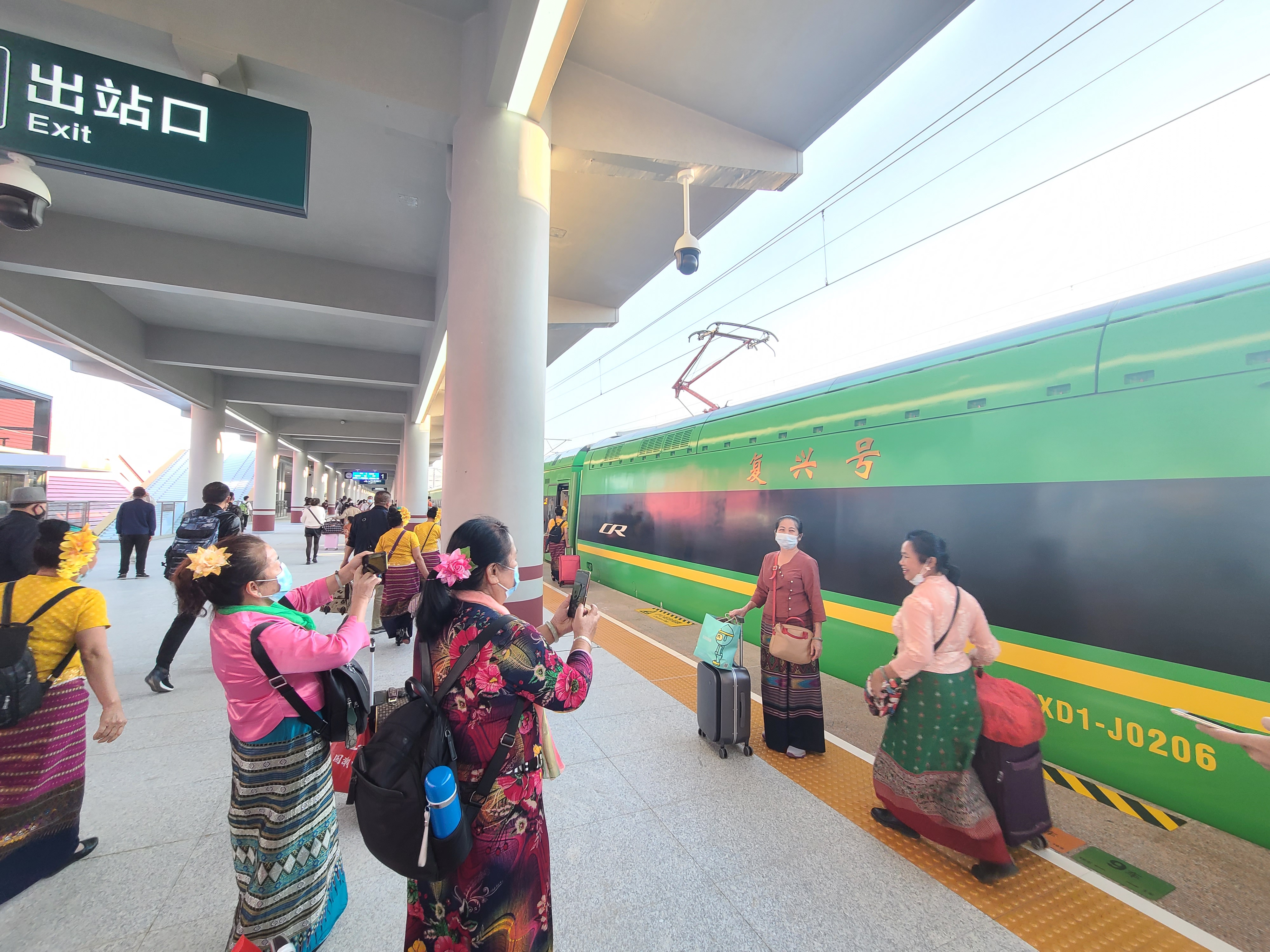 中车株机公司牵头研制的复兴号“绿巨人”,开行于中老铁路。 图为乘客在车旁留影。 企业 供图