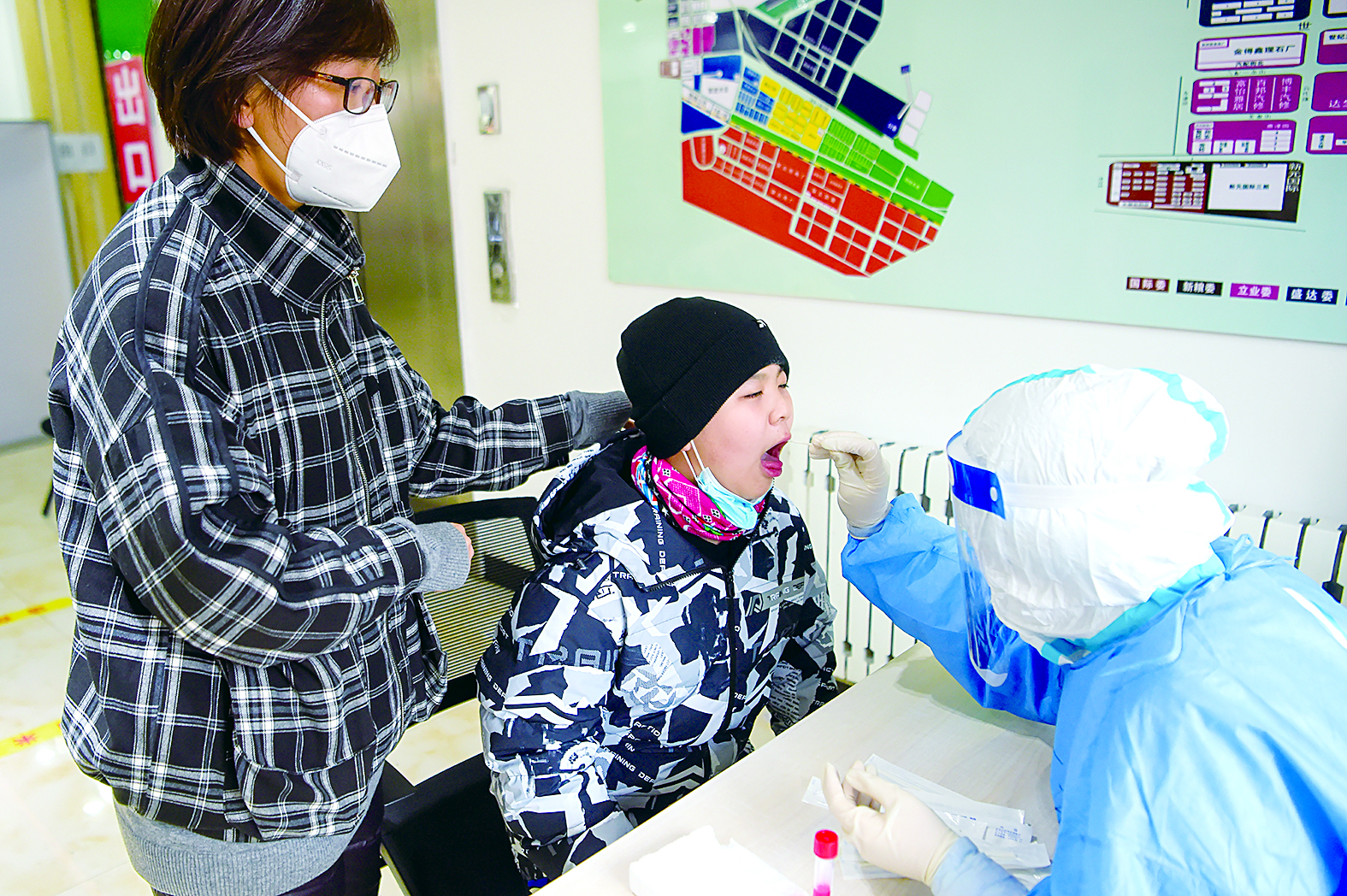 11月29日,在满洲里市东山街道办事处胪膑社区核酸采样点,工作人员为居民做核酸采样。 新华社记者 李志鹏 摄
