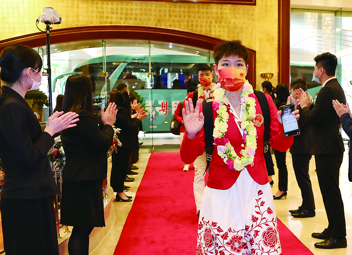 12月3日,受香港特别行政区政府邀请,内地奥运健儿访港代表团乘坐大巴经深圳湾口岸抵达香港,开展为期三天的交流活动。当日东京奥运会羽毛球混双冠军黄东萍抵达香港海景嘉福酒店。 新华社发