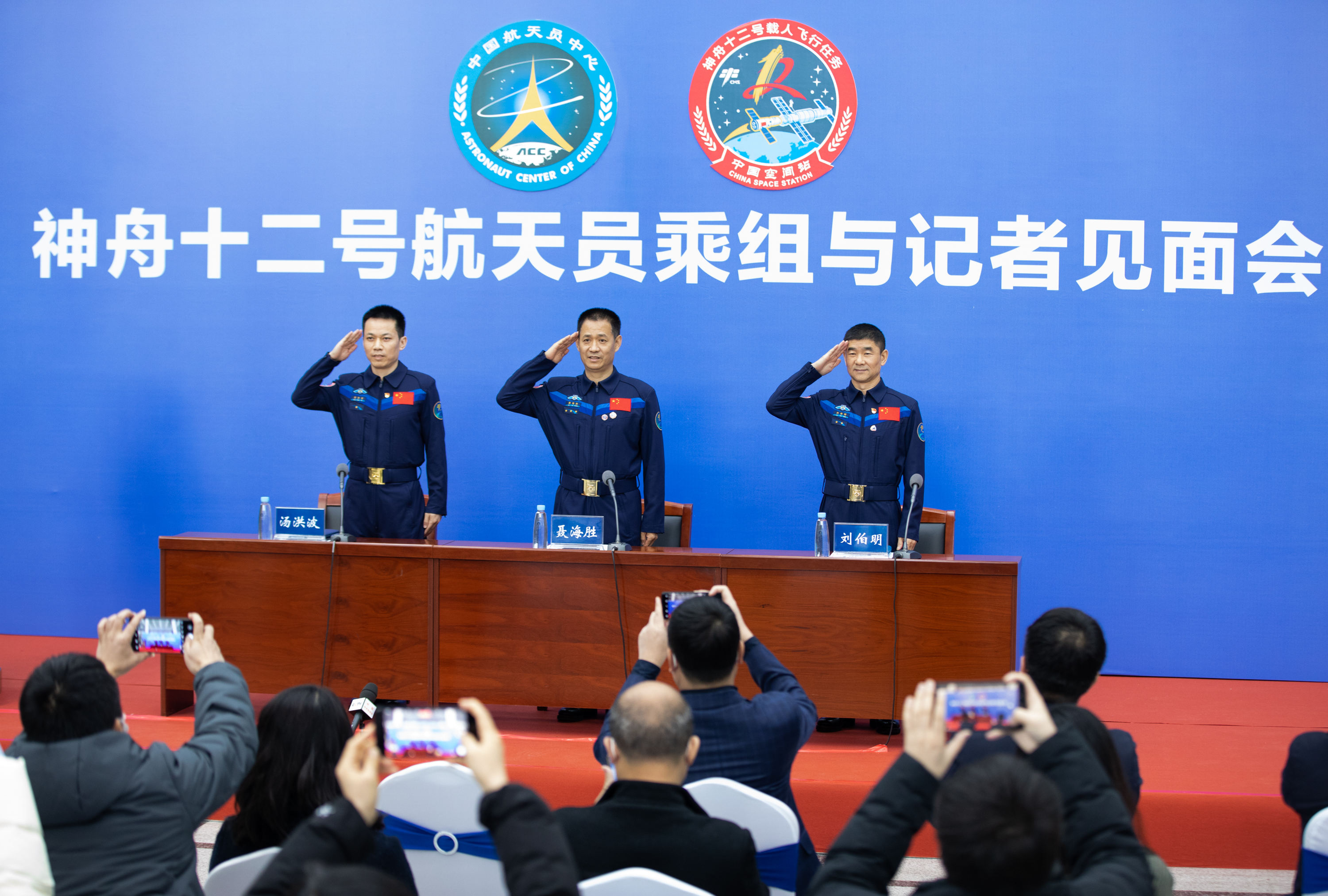 12月7日,在北京航天城举行的见面会上,神舟十二号航天员汤洪波、聂海胜、刘伯明(从左至右)敬礼致意。新华社记者 金立旺 摄