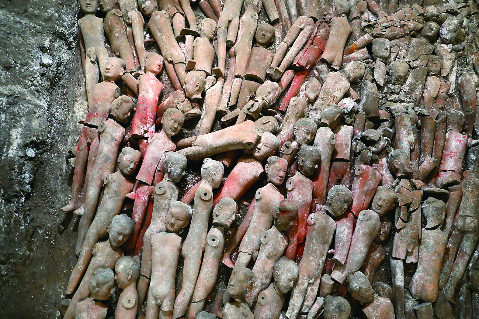 江村大墓外藏坑出土的着衣陶俑(10月8日摄)。新华社发