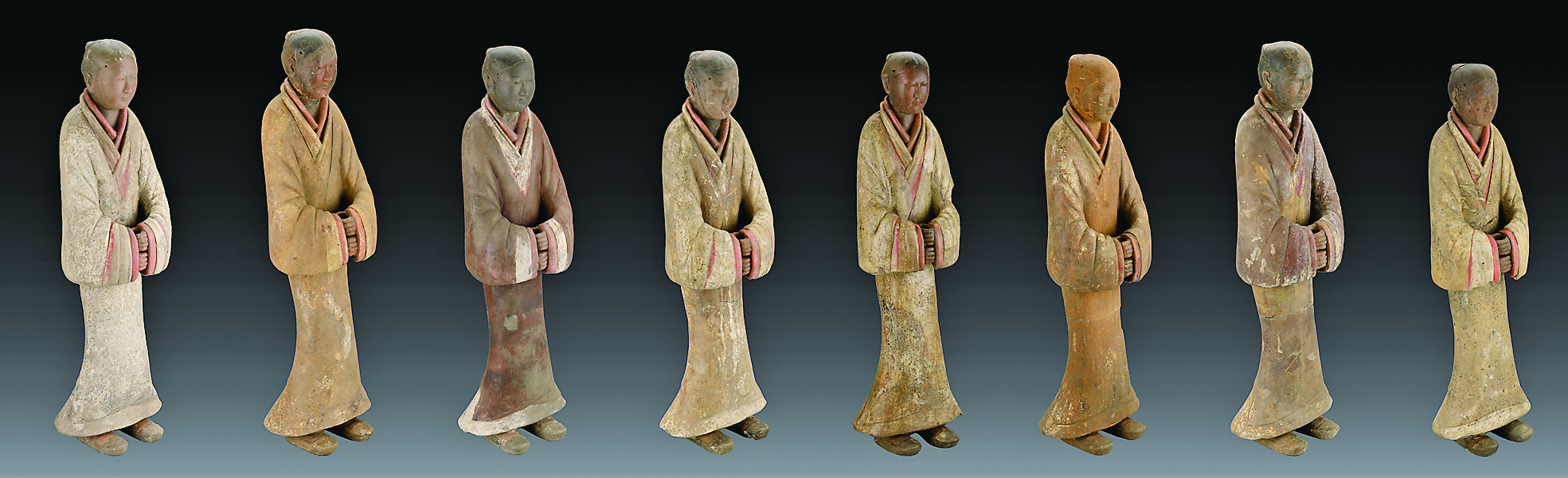薄太后南陵外藏坑出土的一组陶俑(2020年5月7日摄)。