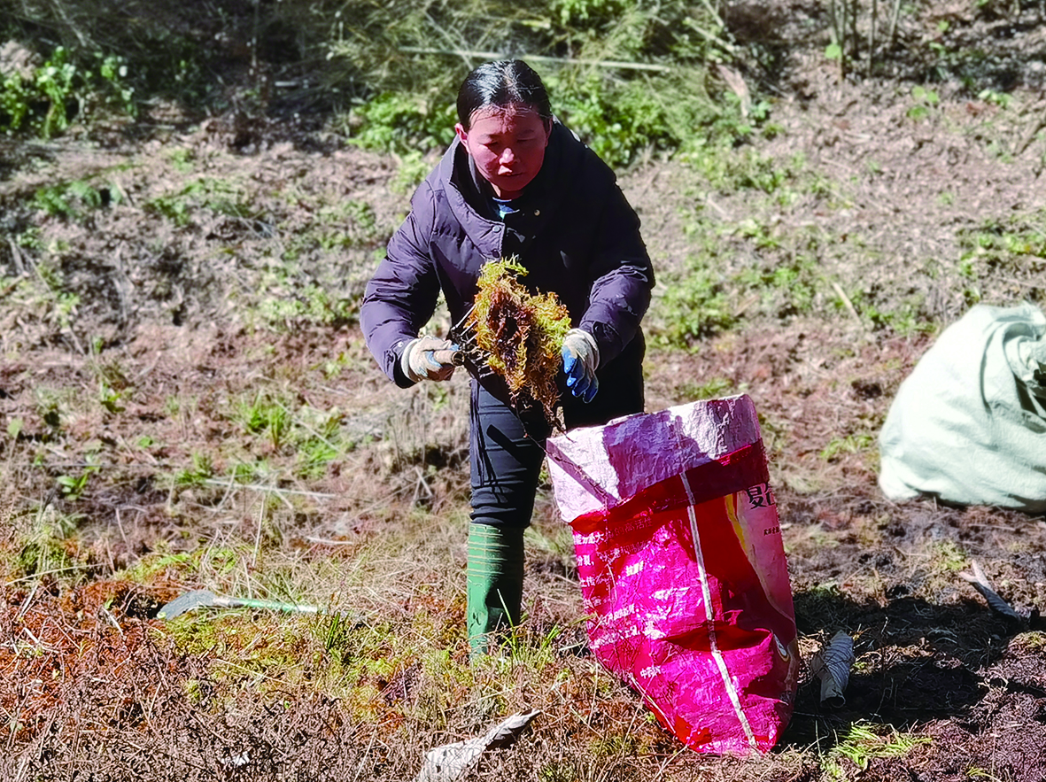 12月8日下午,炎陵县大院农场,爬上一段山路,穿过一片竹林,村民鲁方宇和妻子刘燕平来到一块沼泽地忙碌起来,只见刘燕平穿着套鞋一脚深一脚浅地挪动着,手中的耙子往地里一捞,一簇簇或绿或棕长得像苔藓的植物就捞了上来,被扔进蛇皮袋,不一会儿,蛇皮袋就装满了。