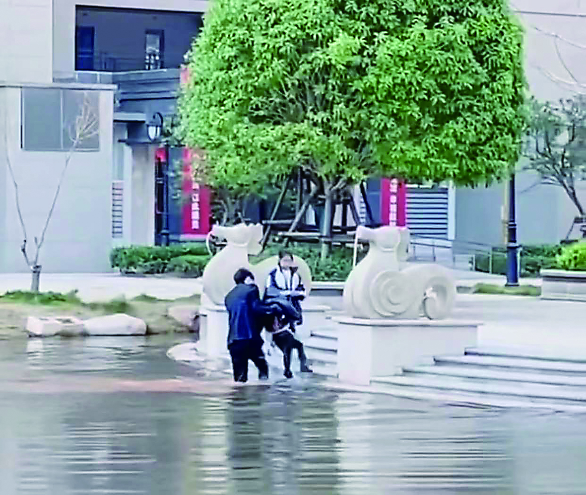 “快来救人,有人掉水里了!”突然,尹侠义听到一名小女孩的求救声,他立刻停止拍摄朝女孩的方向跑去,只见景观池里有一名男童,离岸边两三米远,在五六十公分深的水池中,身子仰面朝下,双手在水面上不断挣扎。尹侠义顾不上脱掉鞋袜趟入水中,快速向男童落水的池中走去,将男童救起。