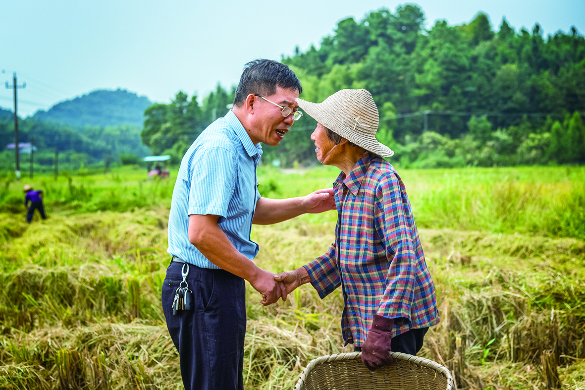 2020年,株洲佳家生态农业有限公司董事长赵正权,走下田间介绍产业帮扶精心培育的优质稻。