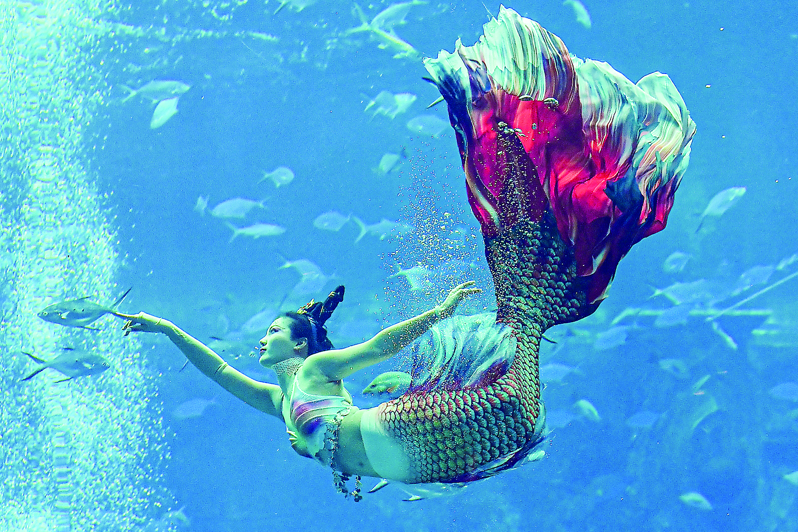 美人鱼表演 12月21日,由国家体育总局水上运动管理中心等单位主办的首届中国美人鱼表演赛在海南三亚亚特兰蒂斯开赛,共吸引来自国内的40余位选手参赛。图为首届中国美人鱼表演赛参赛选手在比赛中。
