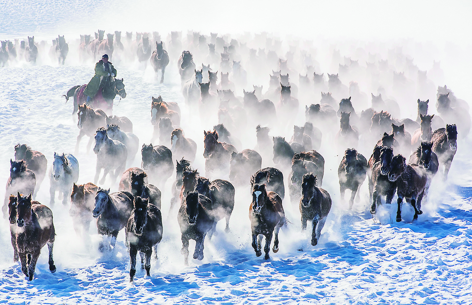 近日,在新疆昭苏县,骏马在雪原上奔驰。