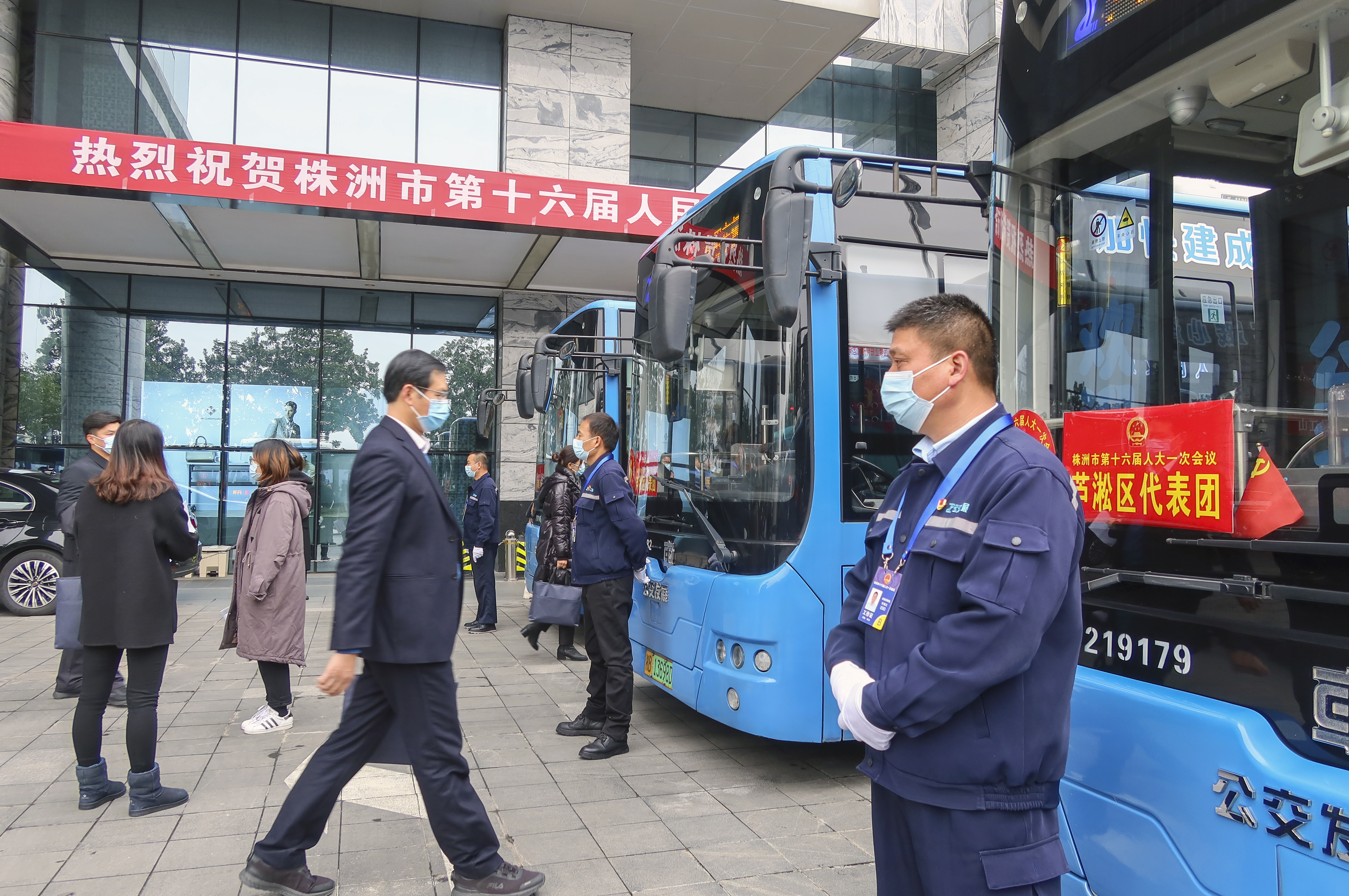 12月29日,人大代表们在驻地乘坐株洲制造的电动公交车,出发至预备会议现场。